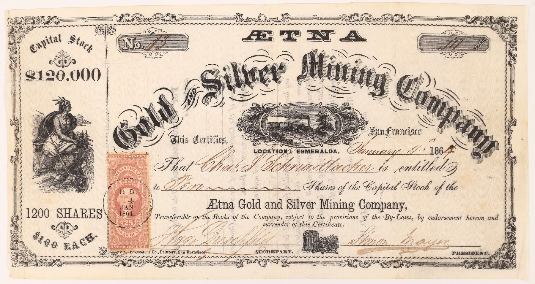 Very rare. "Location: Esmeralda" printed under vignette. Low certificate number 13, issued for 10 shares to Charles Schnaittacher on January 4th, 1864 in San Francisco. Signed by president Simon Mayer and secretary Hugo Dreschfeld. Not cancelled. Black border and print. Three vignettes: Native American (left border), locomotive (center), and dog next to safe (bottom center). Printed by Cooke & Co., SF. 25 cent US IR Power of Attorney stamp with tied cancel. Folds, creases. 5.5 x 10.25" Schnaittacher was a bookkeeper with Max Morganthau in SF. Simon Mayer was a commission merchant and a stockbroker and Dreschfeld a real estate and money agent, both also in S.F. (Ref. Langley's S.F. Directory for 1863, p. 129, 243 and 320.) No information located about this mining company in online newspaper archives.