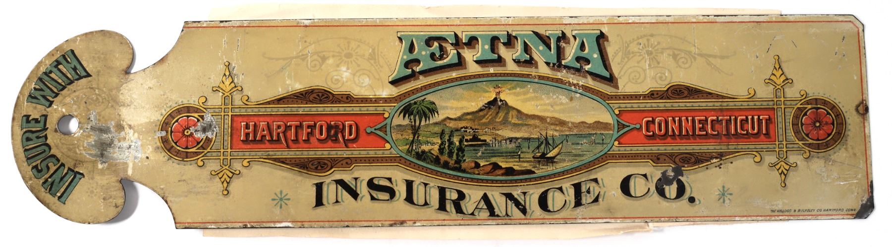 Aetna Insurance metal bookmark with tropical volcanic scene. Also know as an Aetna Firemark which was given to their customers in the late 1880's. 3x12.5"