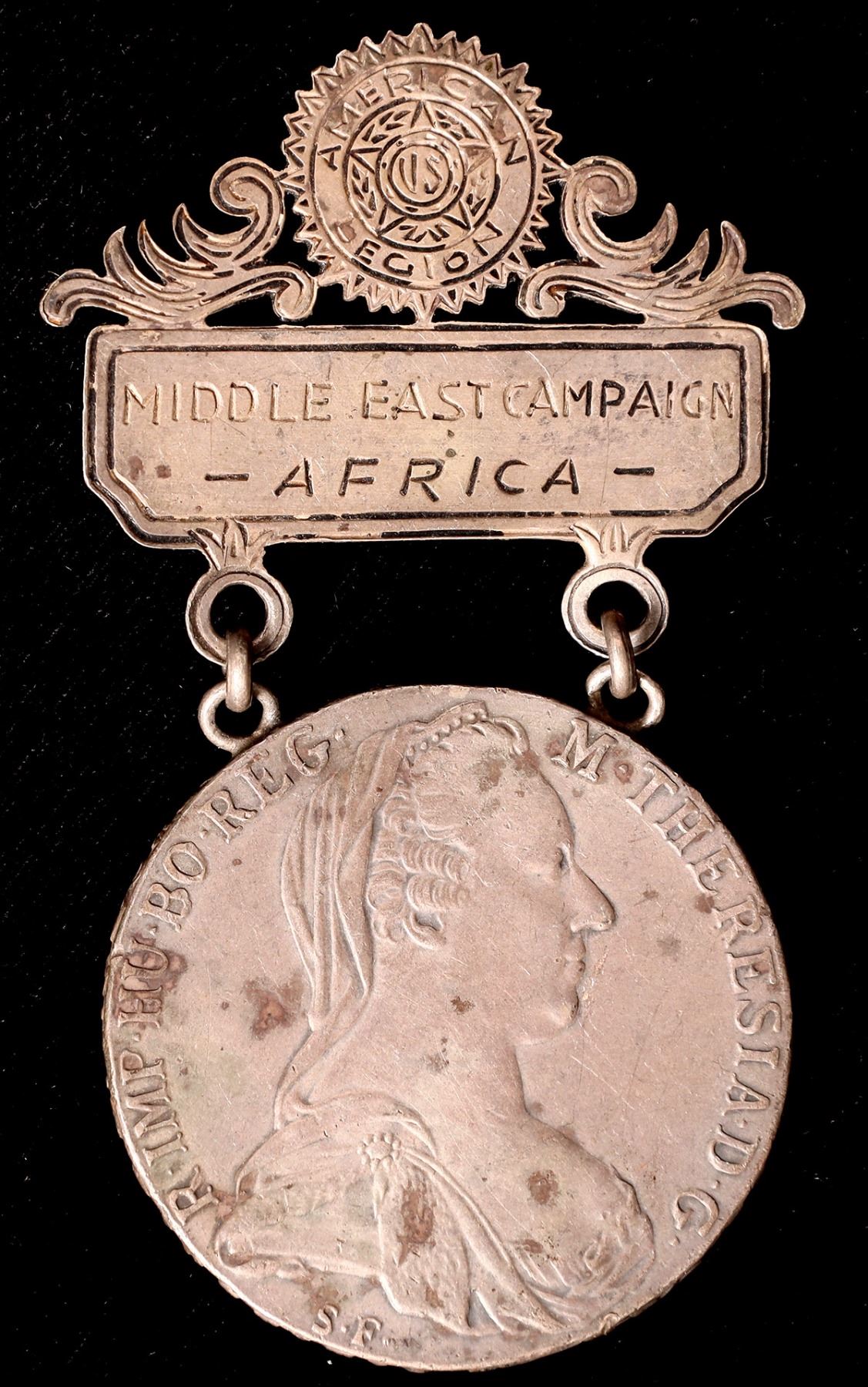 Maria Theresa thaler suspended from pin back engraved: Middle East Campaign / Africa. 3 x 1 1/2 inches.