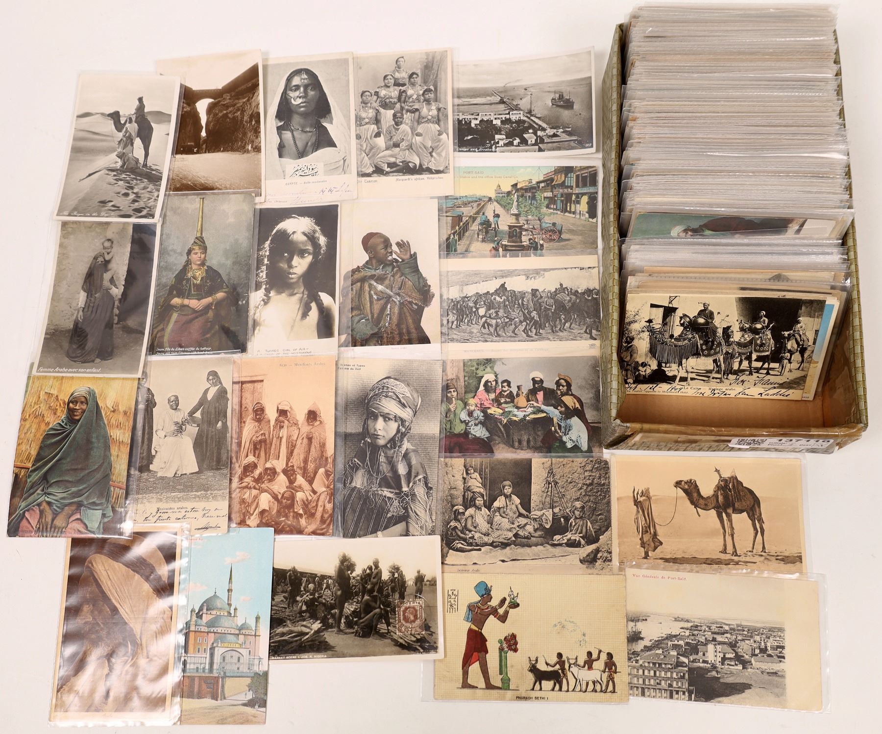 Mostly antique postcards from Egypt, Morocco, Algeria, Sudan, and probably other places in the continent of Africa. Too large a batch to describe in detail -- akin to describing the vast diversity of an enormous continent -- but includes stunningly beautiful portraits of indigenous people, city scenes, desert landscapes, graphical representations of Egyptian art, and so much more. There are B&W, RPCs, tinted lithos, and some full-color postcards. As a set they are a historically significant, yet imperfect, ethnographic snapshot of what the Western world imagined Africa to be like in the early 20th century. Most cards are in poly sleeves, some loose, all in good condition.