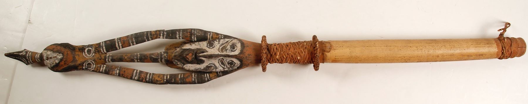 Ornamental African ceremonial staff. Bamboo like handle with large crack, top features bird on end and possible front and rear upside down faces. Braided center grip and bottom braid. 37"