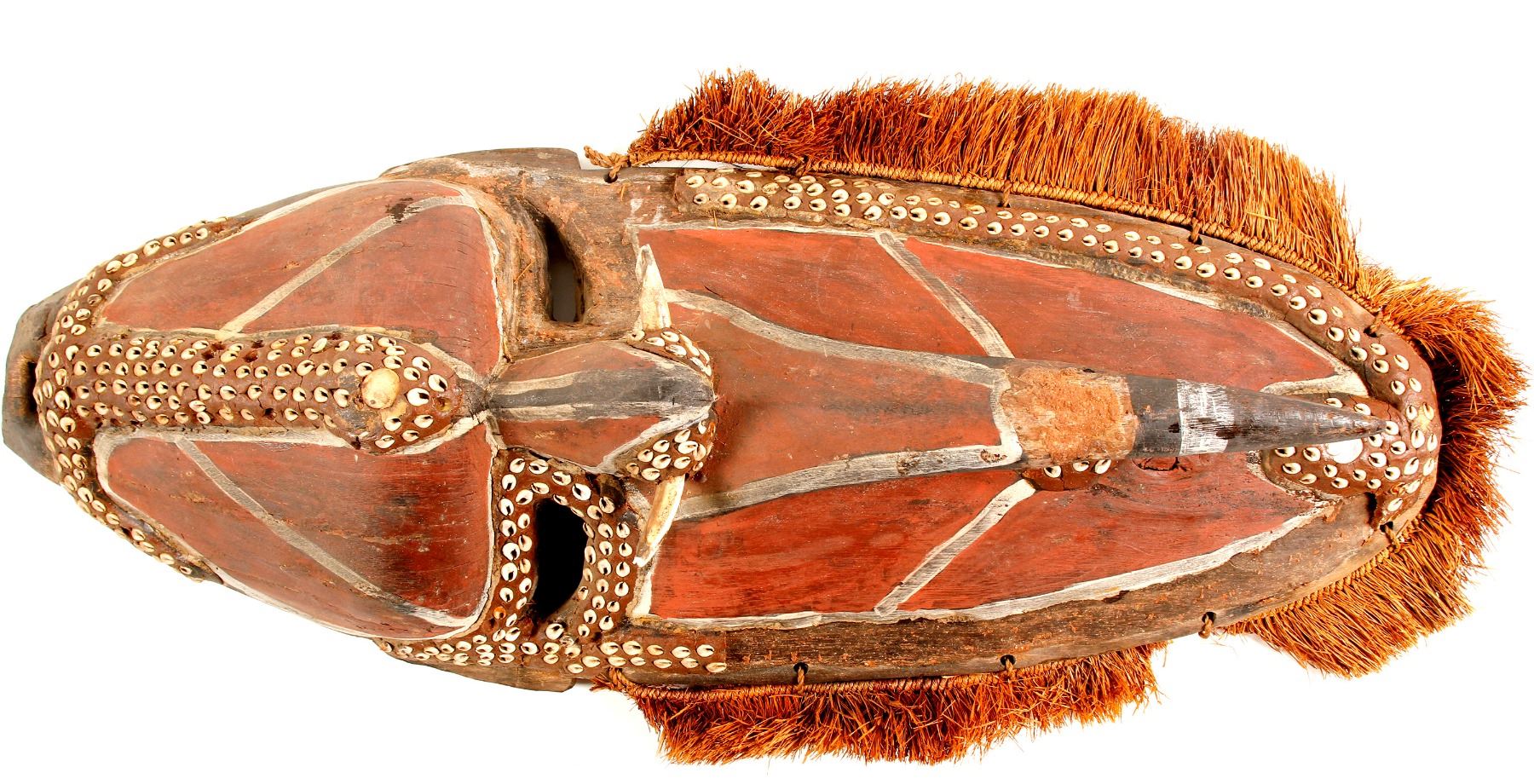 Carved and painted African ceremonial wood mask with coconut straw edges. Boars teeth and small snail like shells. Approx 29x13". Some shell sections are broken off and included.