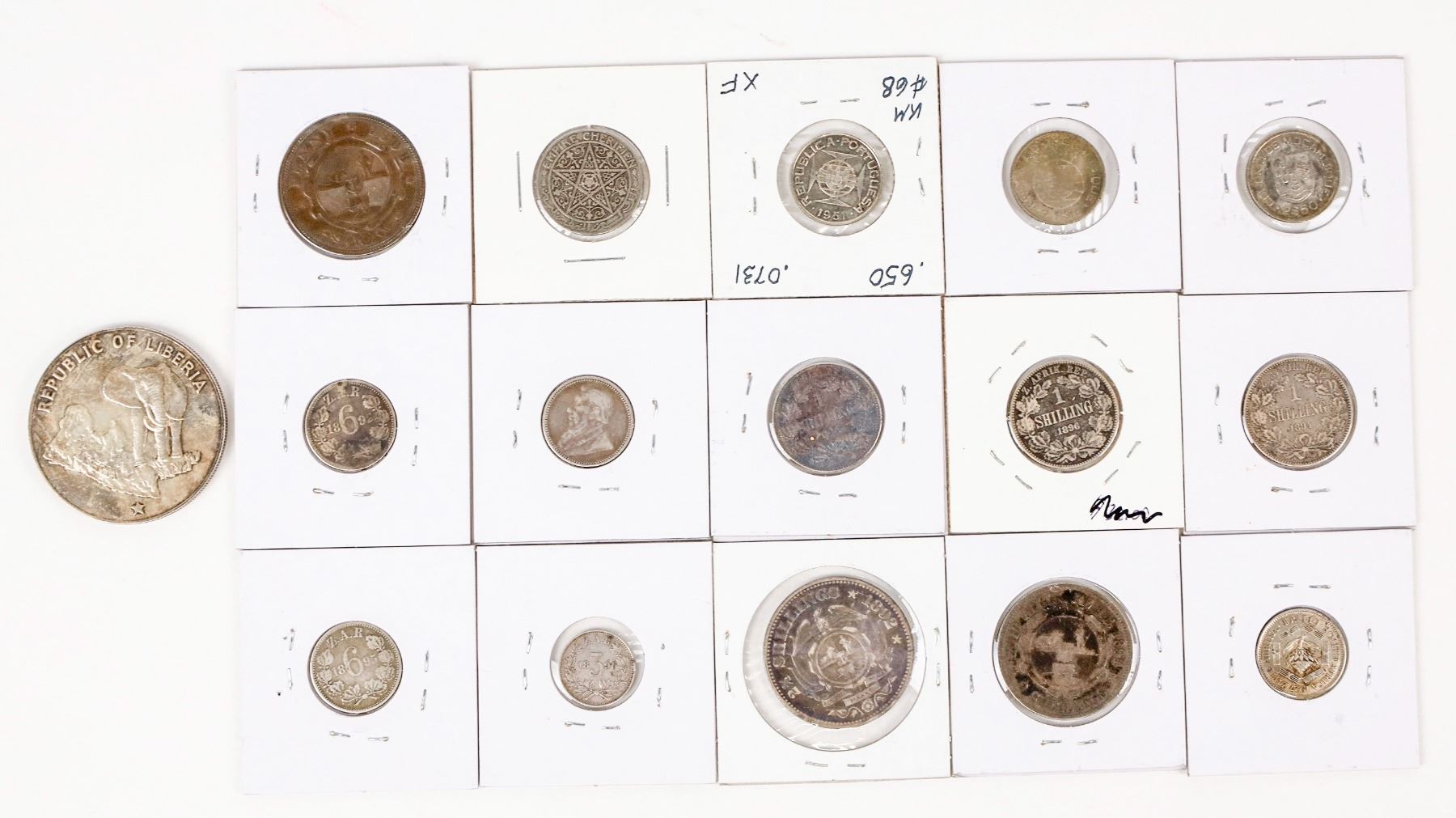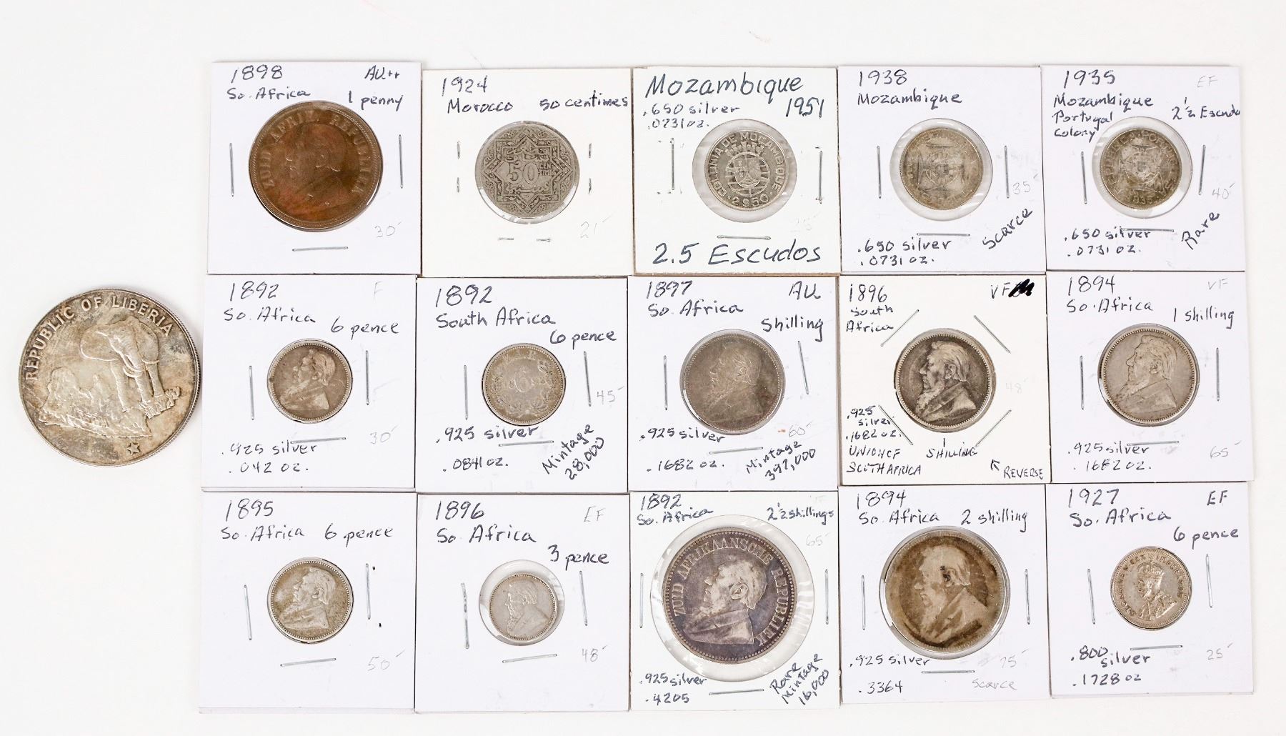 Sixteen African coins: 1973 Republic of Liberia five dollars (.900 silver; .9867 oz.); 1924 Morocco 50 centimes; three coins from Mozambique: 1935, 1938 & 1951 2 1/2 escudo (.650 silver; .0731 oz. each); eleven coins from South Africa: 1898 penny; 1896 three pence; 4 six pence: 1892 (2), 1895, 1927; 3 one shilling: 1894, 1896, 1897 (.925 silver; .1682 oz.); 1894 two shilling (.925 silver; .3364); 1892 two and a half shilling (.925 silver; .4205 oz.)