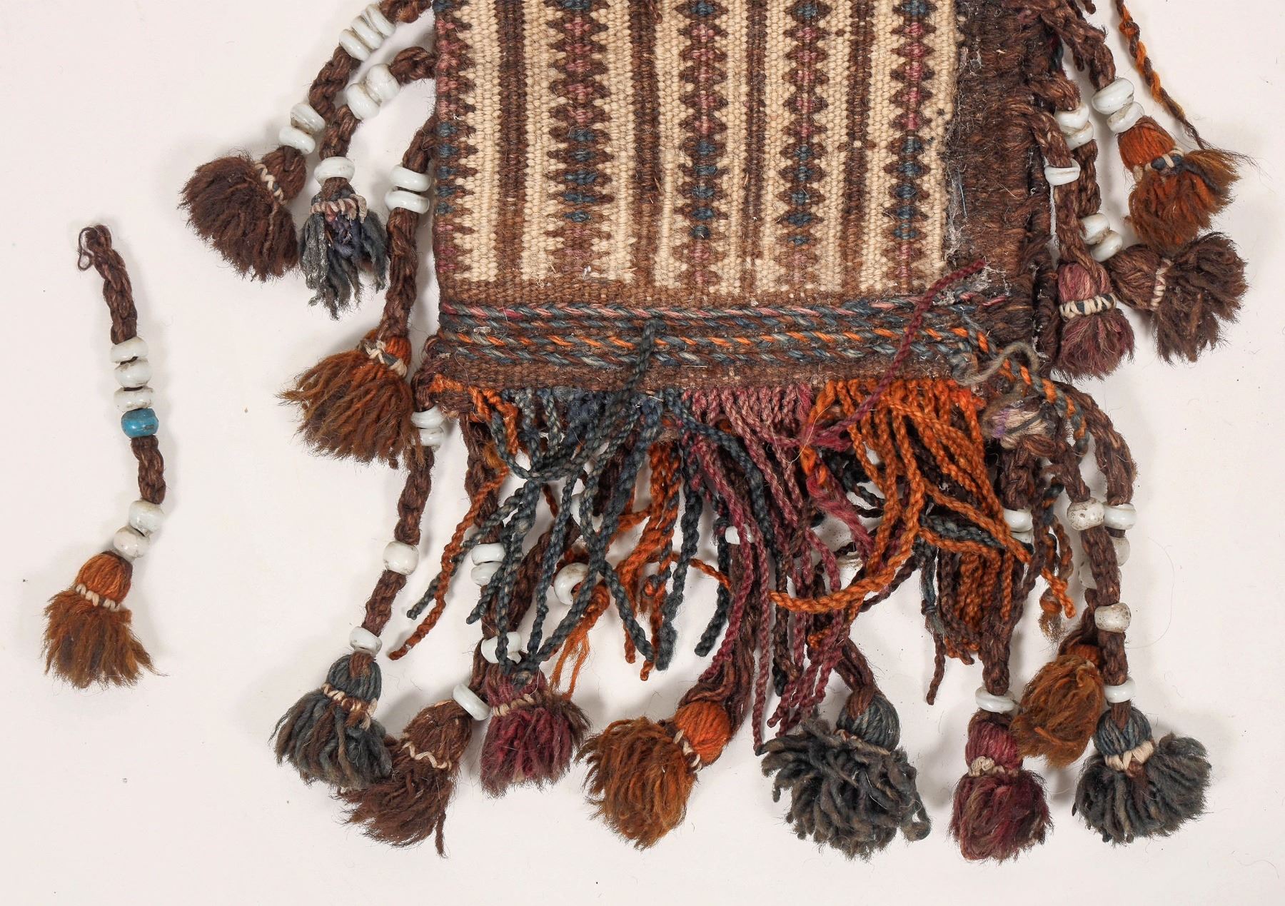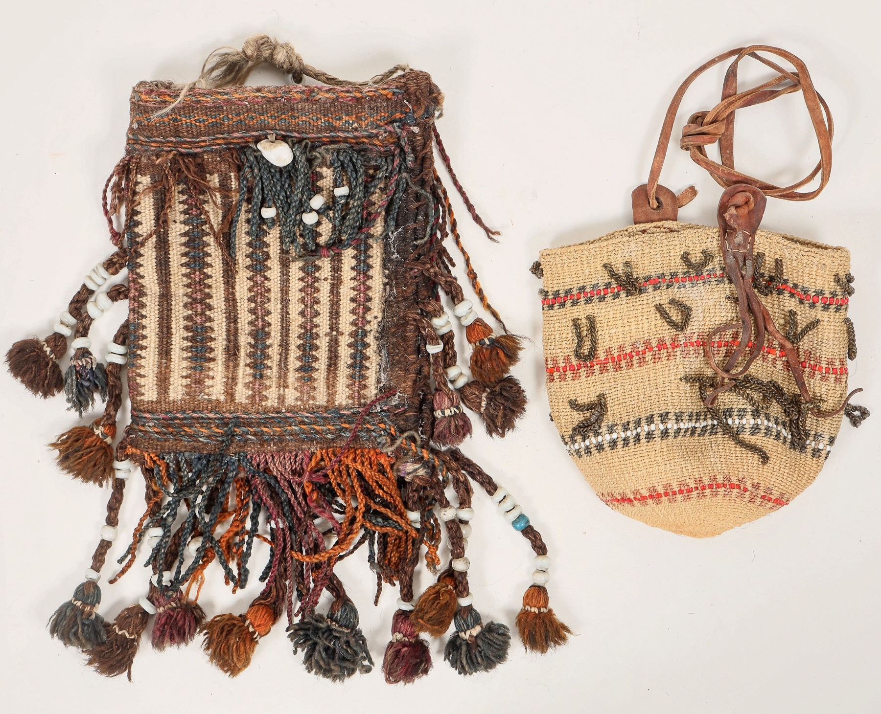 Woven light brown purse with brass chain attachments, 7x7", 2 chains partially detached. Dark brown multi color woven with hanging beaded tassels, 13x7". Please inspect.