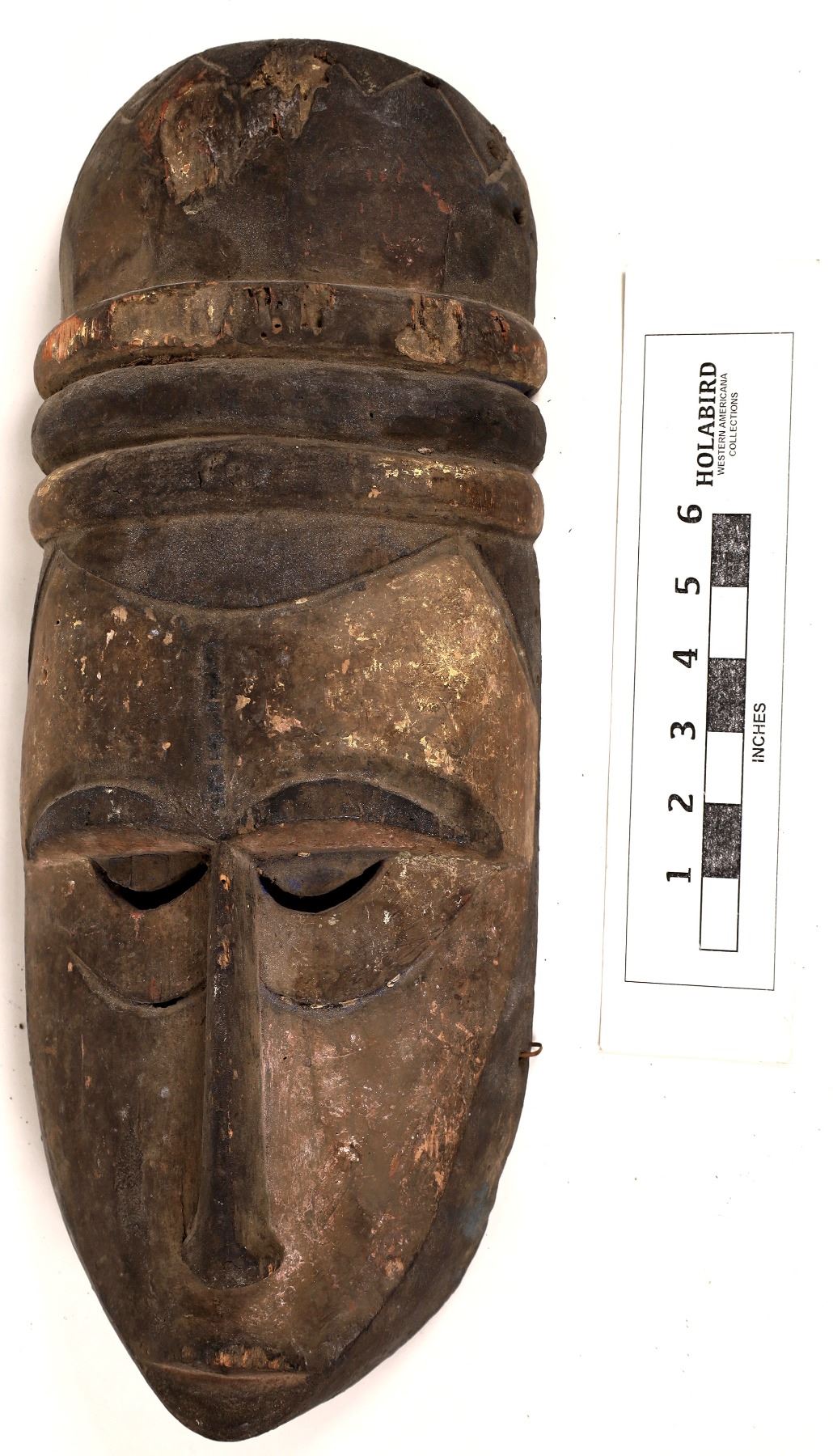 Large wooden mask, described by the attached label as an Ibibio mask, which would have come from the Epko people of Nigeria. The mask is carved from a lightweight wood, and dyed black. Very rustic in appearance, there are wear marks all over the item. Four holes drilled into the left and right sides would have been used to hold the mask on a person's face with cord. There is a hanging wire added to the inside at the top. Overall length is approx. 18-1/2 inches and it is about 6-1/2 inches wide, and 3 inches thick. Please see the photos for design and condition details.