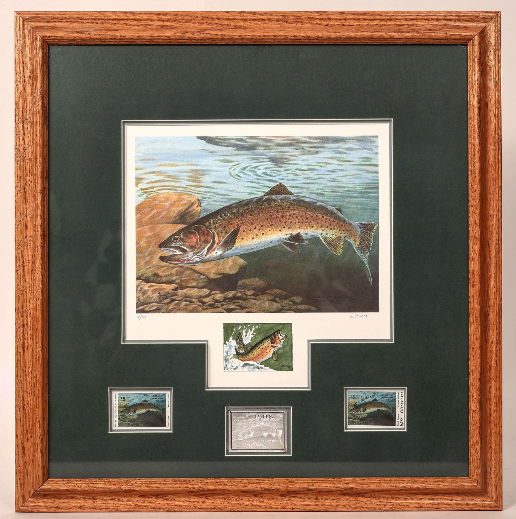 Artist Al Agnew Lithograph: First Nevada Trout Stamp 1986. This is the first Nevada Trout Stamp published to raise money for the fish hatchery at the Mason Valley Management Area. This is the Executive issue 9/50 with the silver medallion. Double matted print 6.5 in. X 9. framed in oak at 18 in. X 18 in. Signed by the artist.
