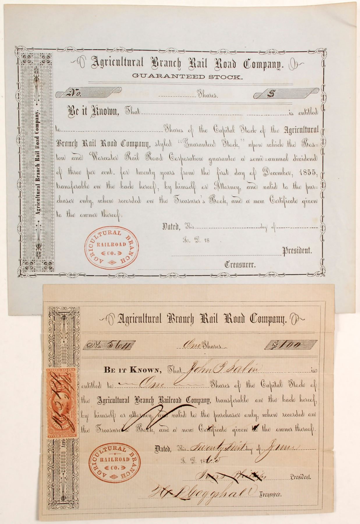 Unissued guaranteed stock for Agricultural Branch Railroad. The railroad began service on December 1, 1855 in Massachusetts being incorporated on April 26, 1847. It connected the cities of Framingham and Northborough. Service began on December 1, 1855. Unlisted in Cox. Ken . Ken Prag Collection
