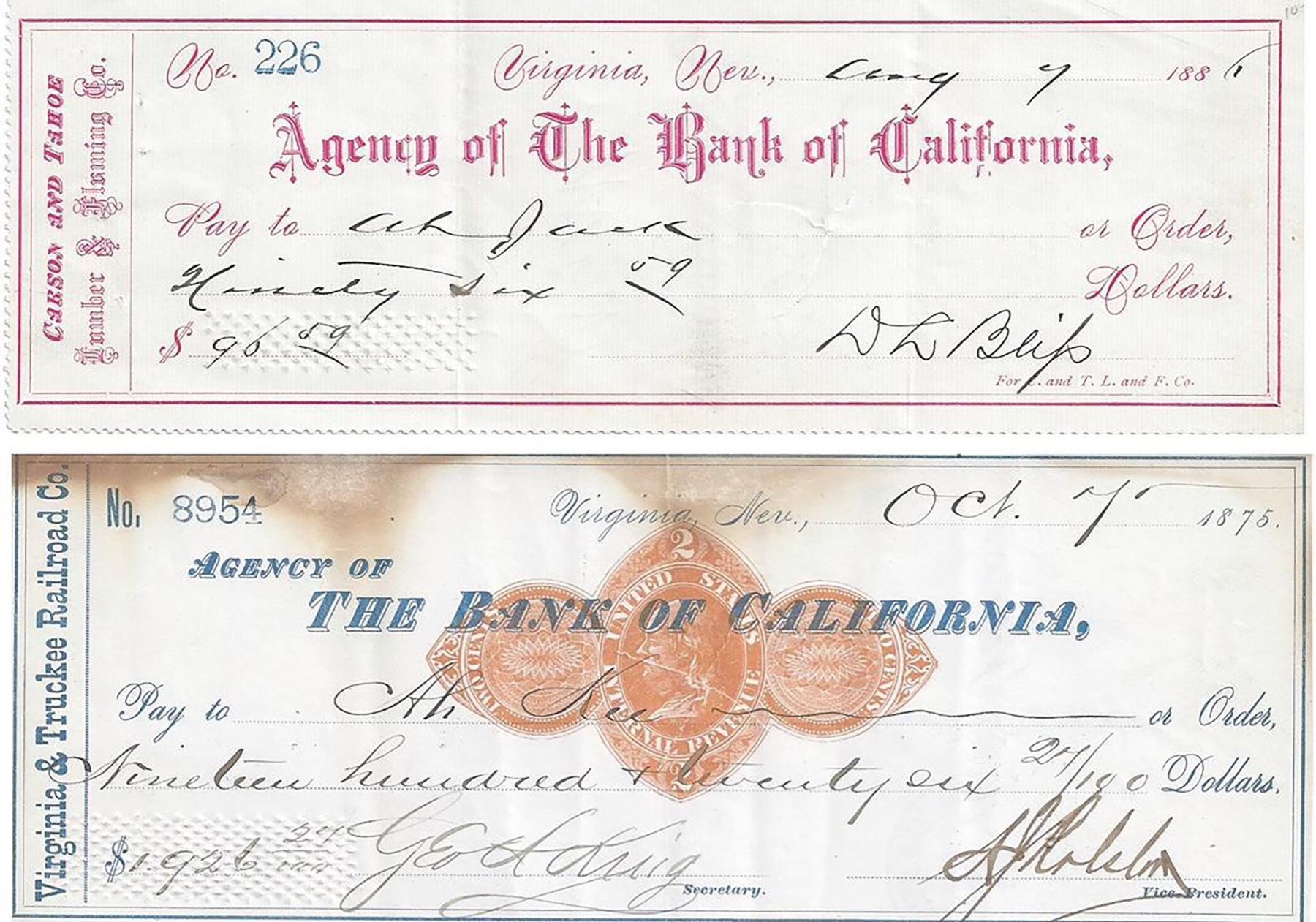 These two checks pack a history wallop. Two Henry Yerington owned companies. Two extremely important Comstock support companies. Signatures from Bliss, Ralston, and King. And maybe most important of all is the two men the checks are made out to: Ah Kee and Ah Jack. They supplied merchandise and Chinese labor for railroad and water companies. Both checks are endorsed by the Chinese entrepreneurs on the back. State: Nevada City: Virginia, Storey Date: HWAC# 99593