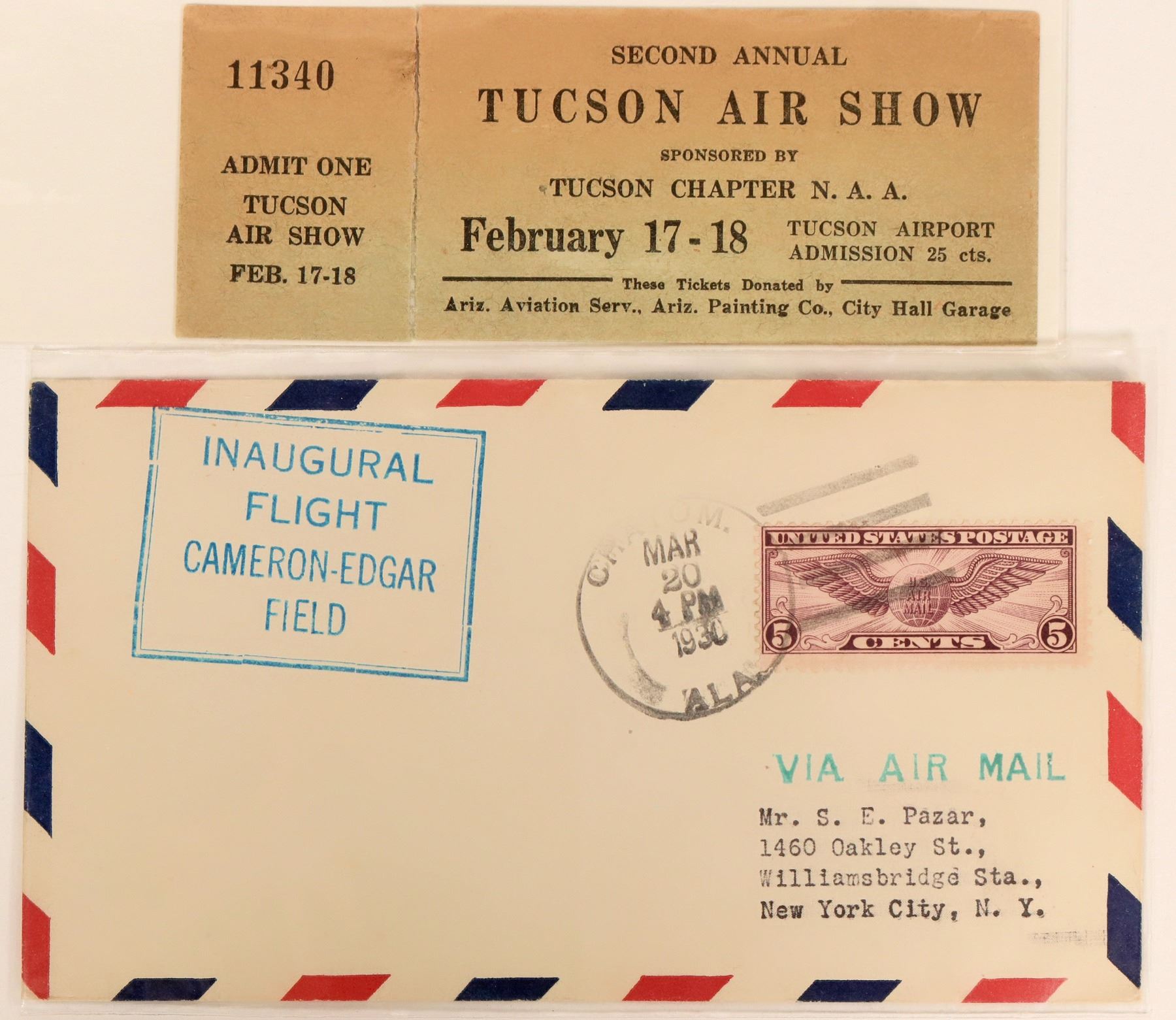Second Annual Tucson Arizona Air Show ticket dated February 17-18 took place at the Davis-Monthan Air Force Base and featured the famous United States Air Force Thunderbirds (1). Included is one Inaugural Flight Postal airmail stamp dated March 20, 1930