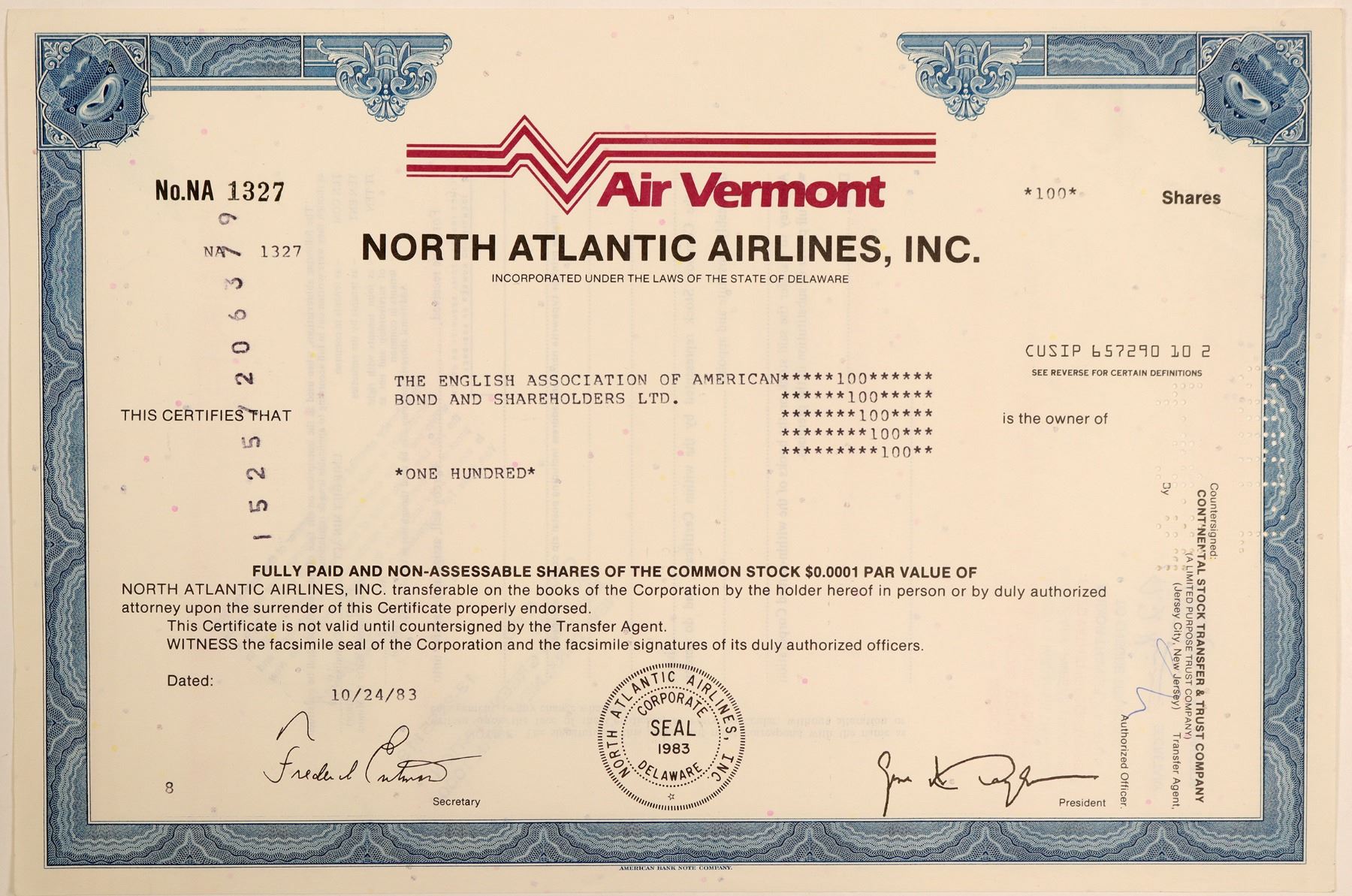 North Atlantic Airlines. Inc. in Delaware, 1983. No. NA1327, issued for 100 shares to The English Assoc. of American Bond and Shareholders Ltd. Printed signatures of the president and secretary. Punch cancelled. Blue border, black print, red company logo. Printed by ABN. 8 x 12" Very good condition. Based in Morrisville, Vermont. Established in 1981 but suspended operations in 1984. Ken Prag Collection