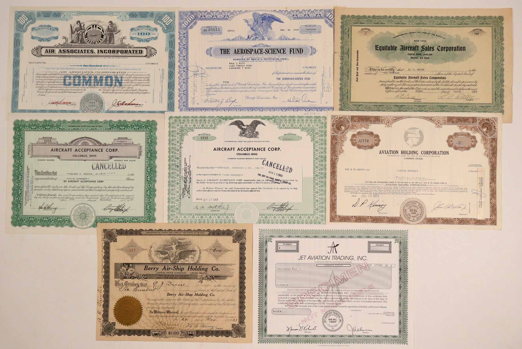 Lot of 8. Included: Berry Air-Ship Holding Co. (1923, inc. in NV, pictorial); Jet Aviation Trading, Inc. (specimen c.1997); Equitable Aircraft Sales Corporation (1929); Aviation Holding Corporation (1973); Aircraft Acceptance Corp. (1967 & 1969); The Aerospace-Science Fund (1964); and Air Associates, Incorporated (specimen). Ken Prag Collection
