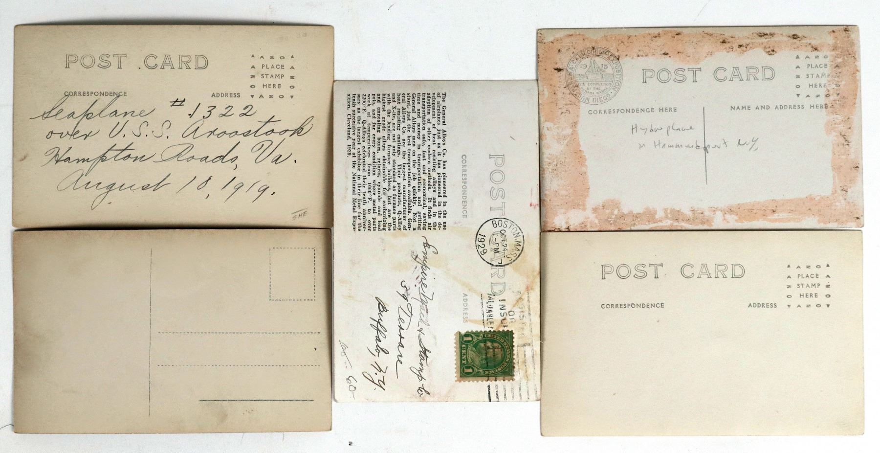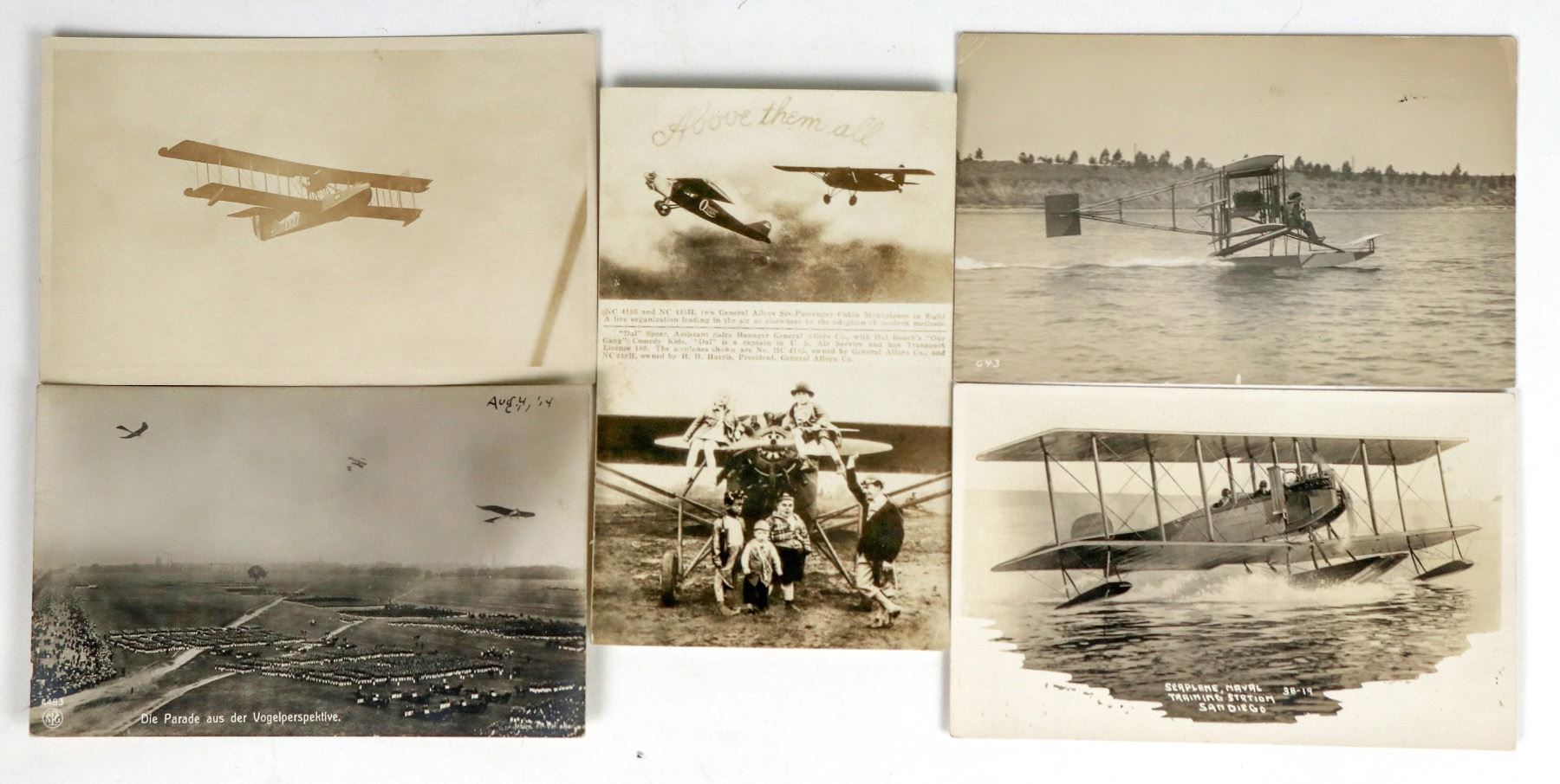 A collection of 5 postcards of early aircraft, domestic and foreign, c1904-29. All RPCs. Includes 4 American, 1 German: "Die Parade ous der Vogelperspektive. Aug. 4, '04"; "Seaplane, Naval Training Station, San Diego"; "Above them all," with two photos of monoplanes," postmarked Boston, 1929; "Seaplane #1322 over U.S.S. Aroostook Hampton Roads, Va. August 10, 1919."; Hydroplane in Hammondsport, N.Y.," Panama-California Exposition-San Diego, 1915, seal.