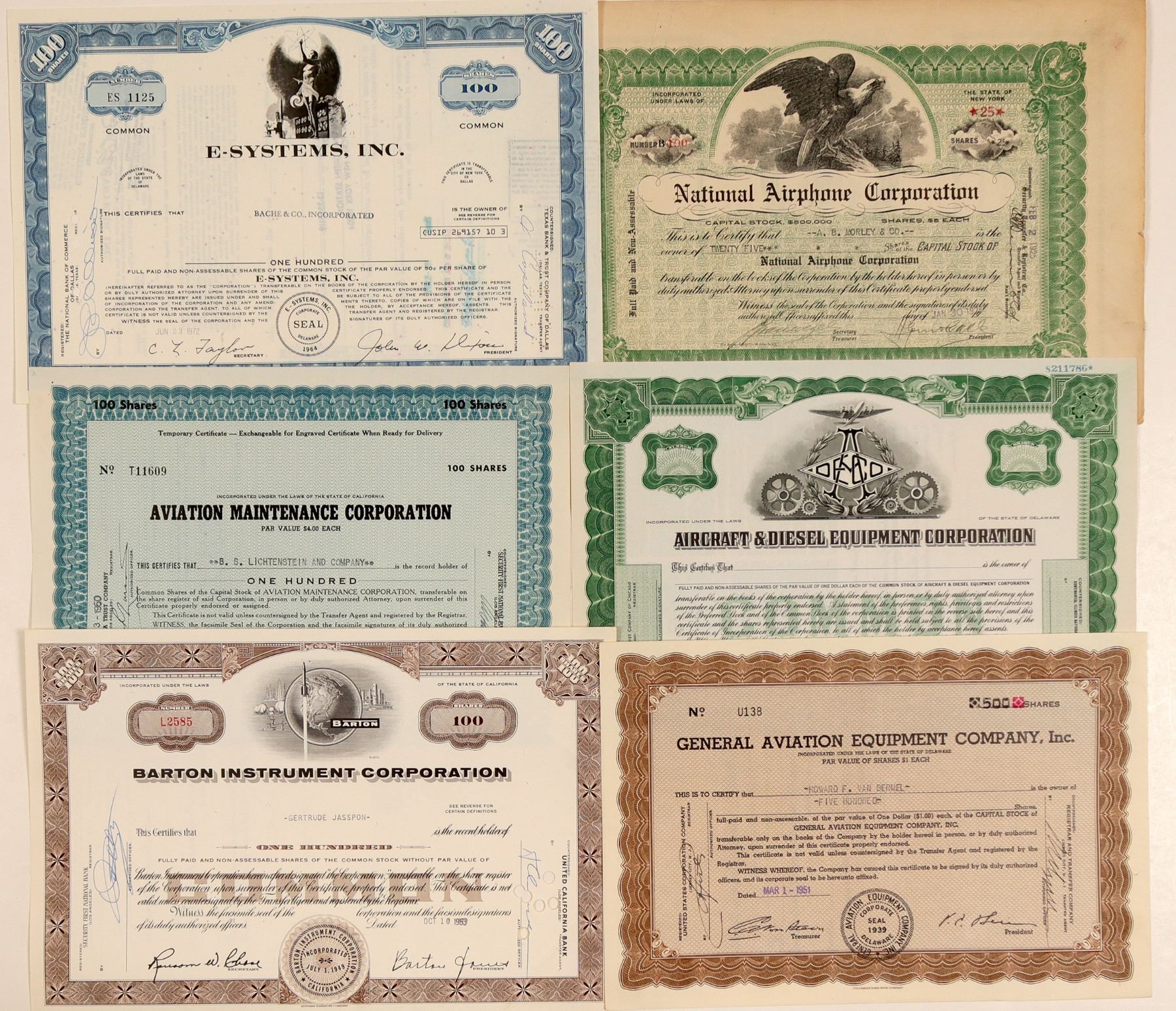 Lot of 6 different. Includes: National Airphone Corporation (1926); Aviation Maintenance Corporation (1950); Aircraft & Diesel Equipment Corporation (unissued Specimen); General Aviation Equipment Company, Inc. (1951); Barton Instrument Corporation (1963); and E-Systems, Inc. (1972). Generally good condition. Ken Prag Collection