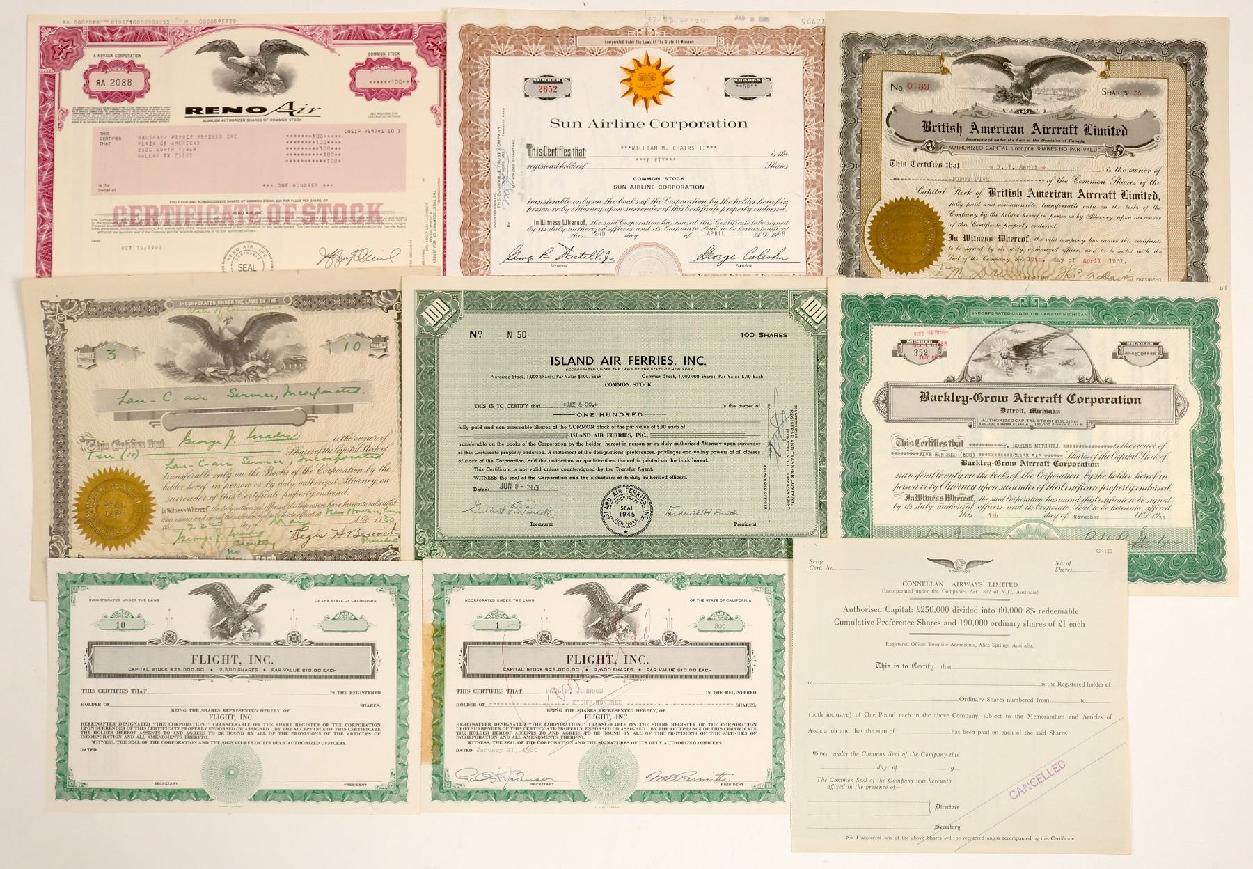 Lot of nine. 1) Barkley-Grow Aircraft. # 352, 1938 Vignette with 3 airplanes and a dirigible. Signed by secretary Grow! 2) British American Aircraft Limited. #739. 1931. 3) Island Air Ferries, Inc. # 50. 1953. 4) Most unusual Lan-C-Air Service, Incorporated. Title of company is hand written. # 3. 1930. 5) Sun Airline Corporation. # 2652. 1968. Bright yellow sun vignette. 6) Reno Air. 1992. # 2088. 6) Connellan Airways Limited. Cancelled. Not issued. 8) Flight, Inc. Unissued. # 10 (low number not issued, must be rare. 9) Flight, Inc. NUMBER 1. 1960. Cancelled. Rare! Ken Prag Collection