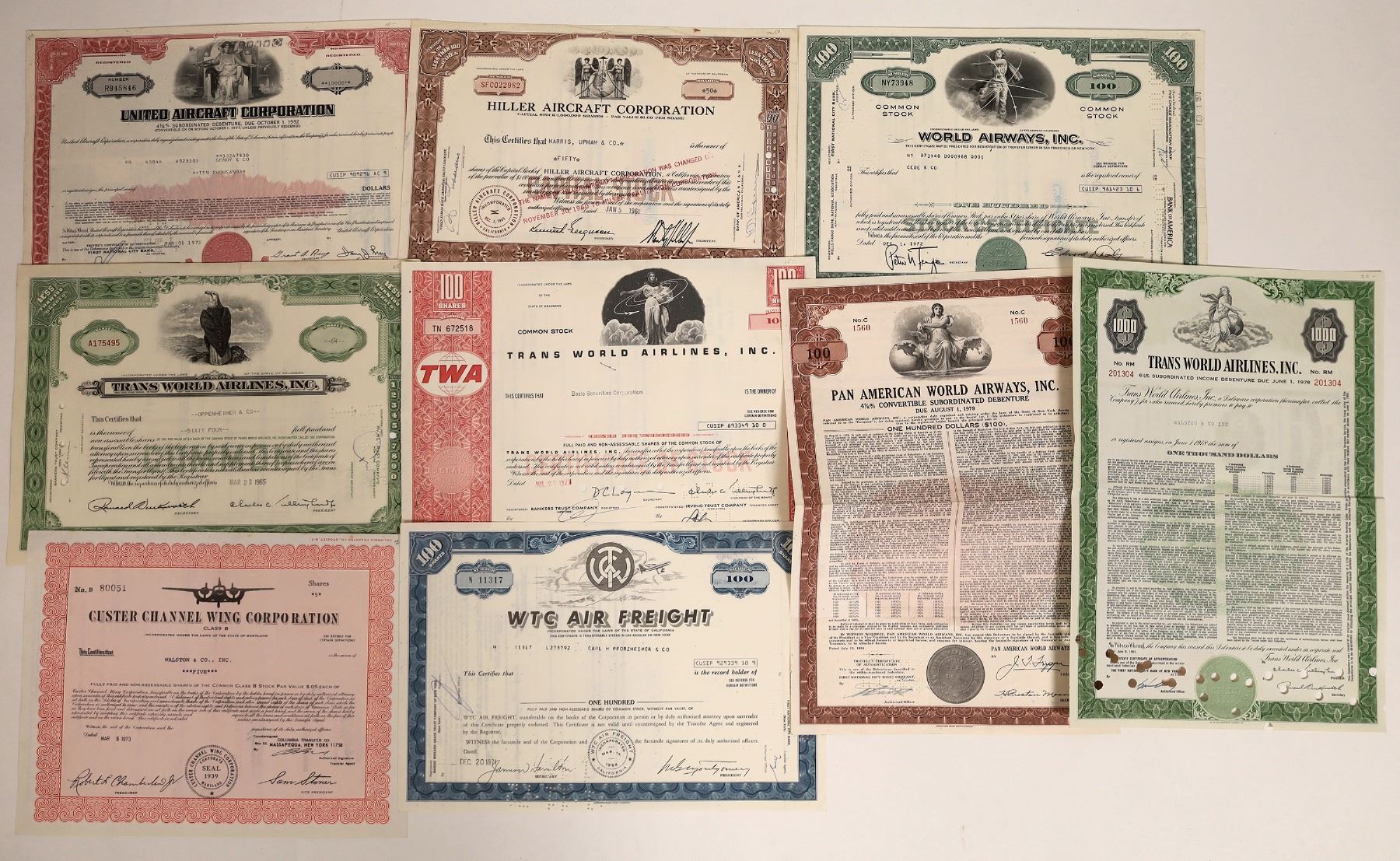 Two varieties of common stocks from TWA (Trans World Airlines). Also, a $1000 bond from the company. Also a bond from Pan Am, and stocks from Hiller Aircraft, Custer Channel Wing, World Airways, Inc., WTC Air Freight, and a bond from United Aircraft. Average condition.