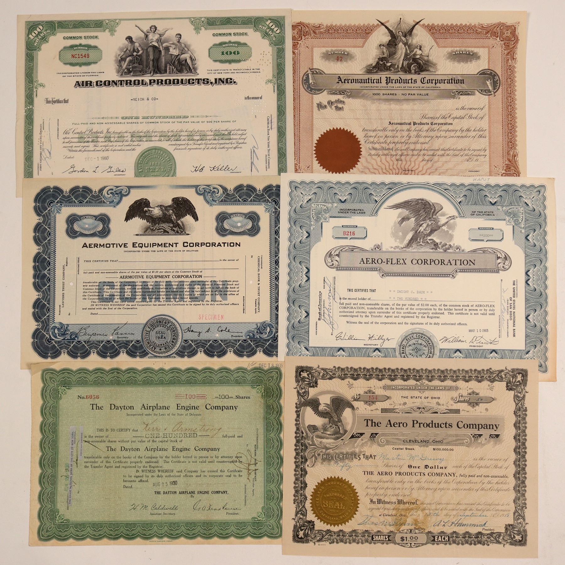 Lot of 6 different. Included: Aermotive Equipment Corp. (unissued Specimen); Aero-flex Corp. (1965); The Aero Products Company (1918); Aeronautical Products Corp. (unissued); Air Control Products, Inc. (1960); and The Dayton Airplane Engine Company (1930). Fair to very good. Ken Prag Collection