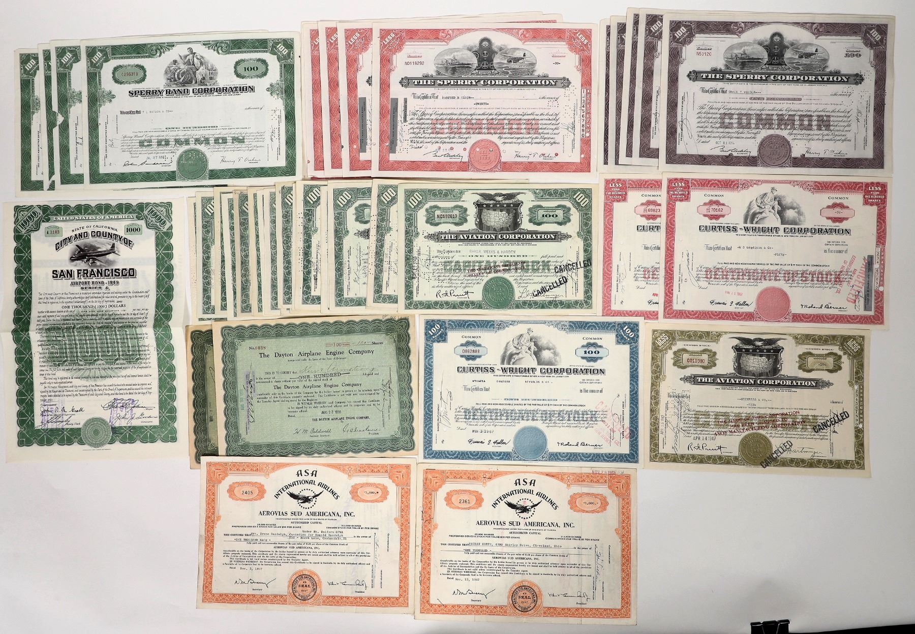 50 or more airplane related mostly stocks and bonds, 1930-67. ASA Intl., San Francisco Airport, Aviation Corp., Dayton Airplane Engine, Sperry, Curtiss-Wright etc.