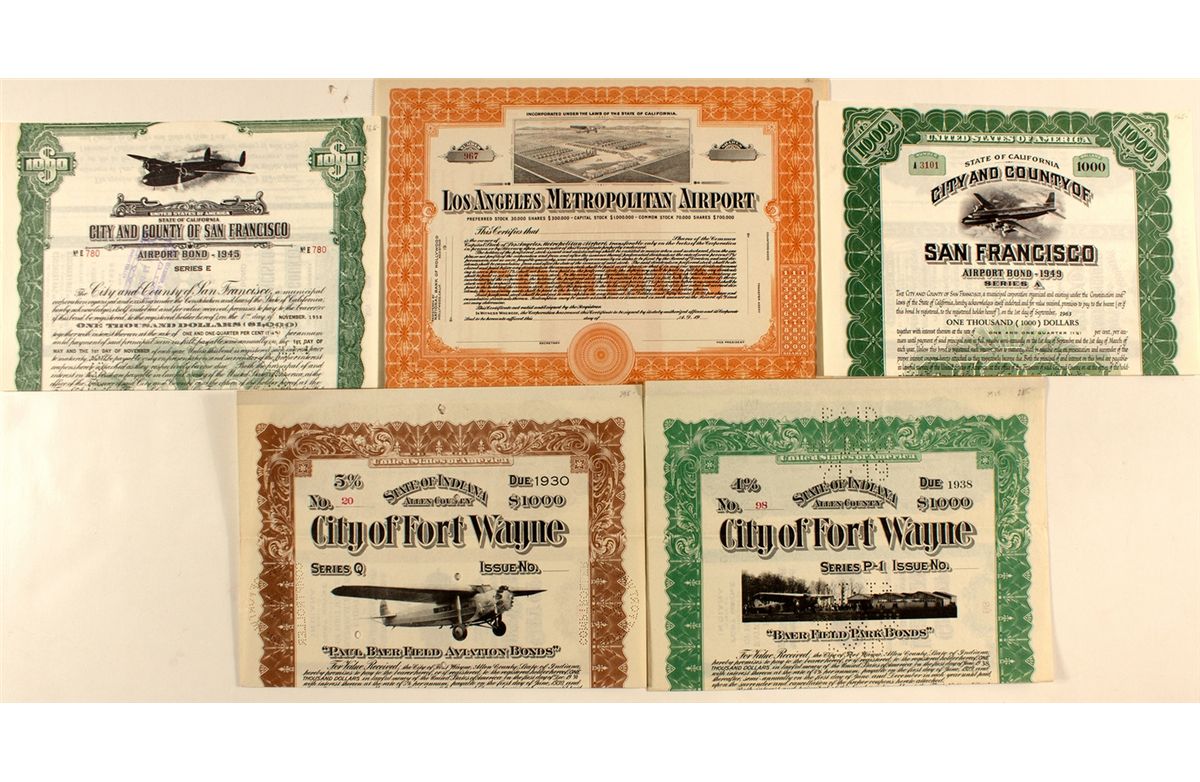 Group of 4 bond certificates and one stock certificate. Two from the county and city of San Francisco, stamped paid, issued in 1945 and 1949. Two from the City of Fort Wayne, Allen County, Indiana; stamped paid, issued in 1928 and 1929. Los Angeles Metropolitan Airport stock certificate, unissued, registered by the National Bank of Hollywood, Hollywood, Calif. Three have airplane vignettes, while two have airport dominated vignettes.