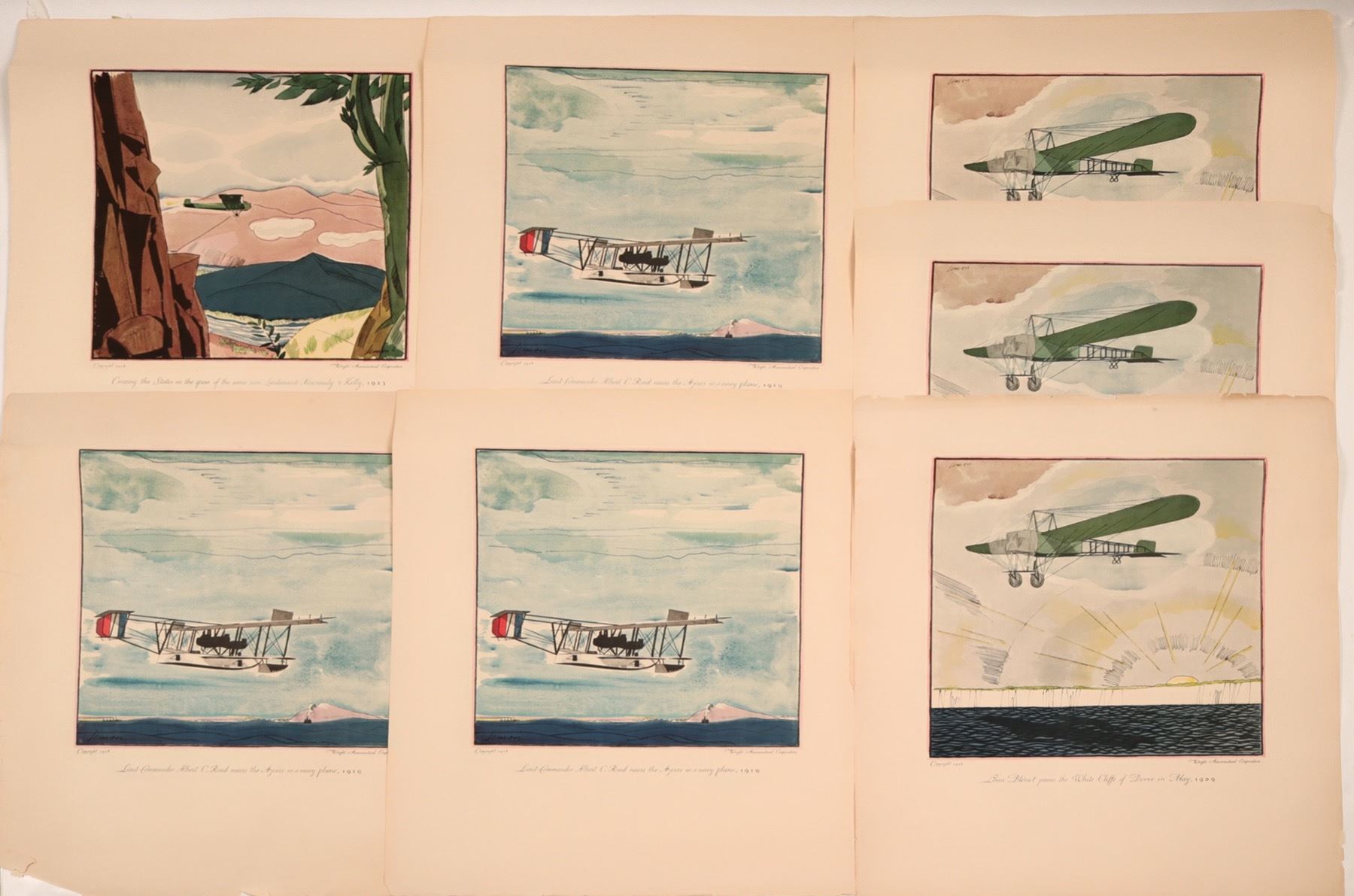 All 7 measuring approx. 11.5" x 12"; 1) Lieutenant-Commander Albert C. Read nears the Azores in a navy plane, 1919; there are 3 of these prints, 2) Crossing the States in the span of the same sun. Lieutenants Macready & Kelly, 1923 (1 print); 3) Louis Bleriot passes the White cliffs of Dover in May, 1909.(There are 3 of these prints). All are in good condition, colors are good. There are chips in outer borders of paper but none encroach on print. Beautiful prints, ready to frame. Would look nice in any aviation buffs home or office. City: State: Date: c1928