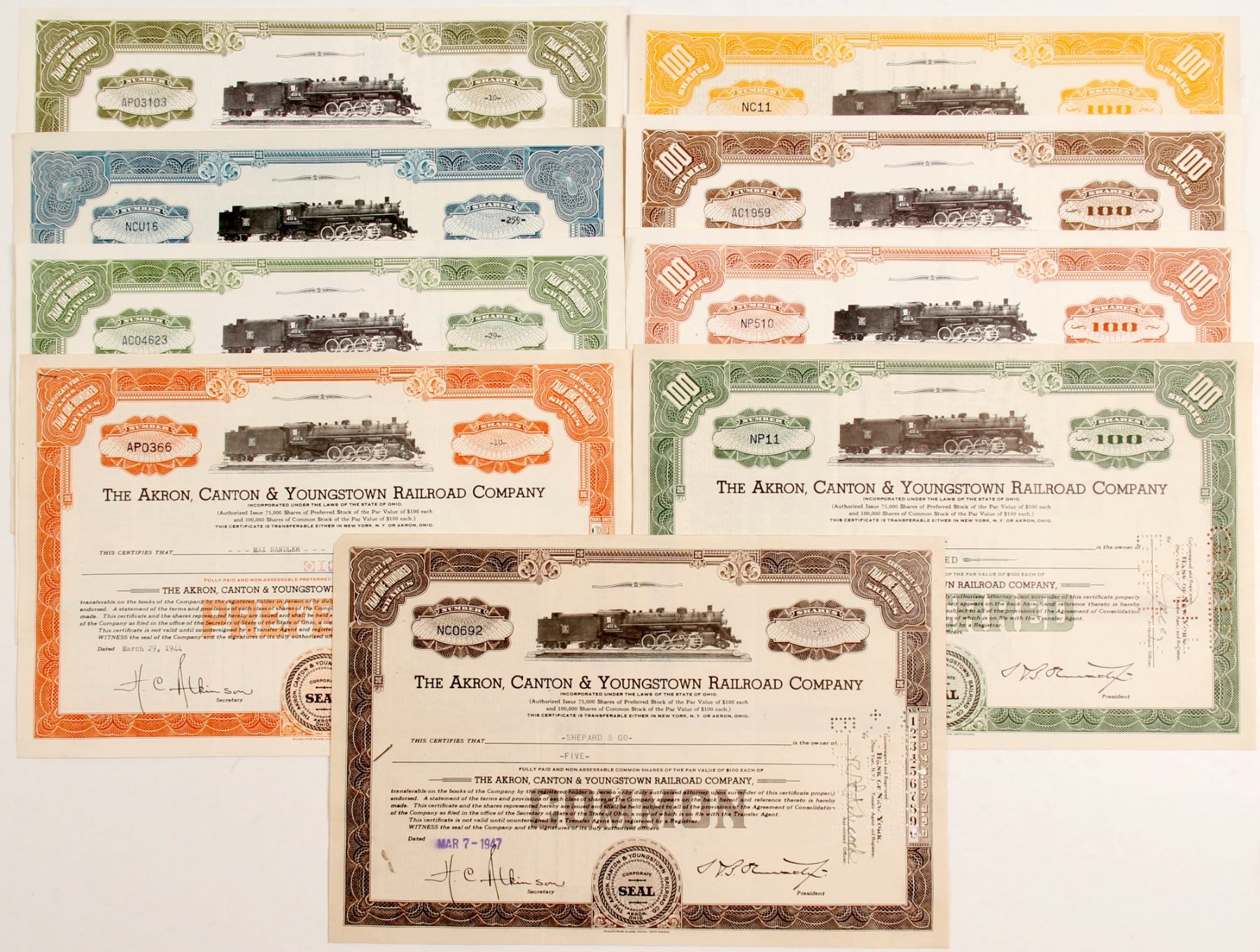 Nine cancelled shares of Akron, Canton & Youngstown Railroad Company. 1) 100 shares for J. N. Russell & Co. Inc. Nov 24, 1961 Number AC1959; 2 100 shares for C.A. England & Co March 31, 1944 Number NC11; 3) 100 shares for C.A. England & Co March 31, 1944 Number NP11; 4) 100 shares for William M. Bassett October 4, 1954 number NP510); 5) 29 shares shares for Rudolph E. and Evelyn M. Schroeder February 21, 1962, Number AC04623); 6) 259 shares for Martha P Hanson February 6, 1964, Number NCU16; 7) Ten shares for Estate of Laura Le Beau, decreased, March 2, 1955, Number AP03103, revenue stamps; 8) Ten shares for Max Sandler, March 29, 1944, Number AP0366 March 29, 1944; 9) Five shares for Shepard & Com, March 7, 1947, Number NC0692.