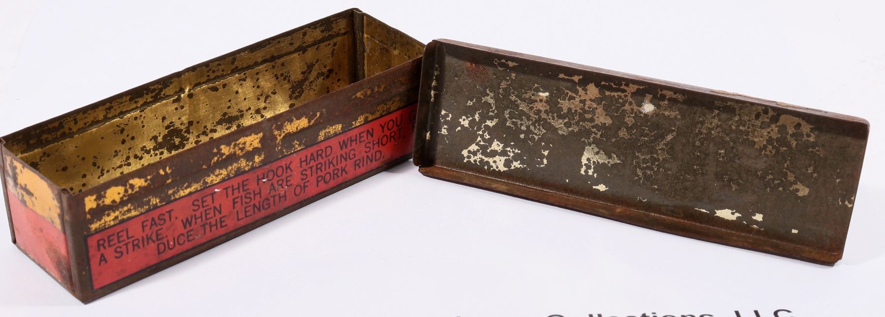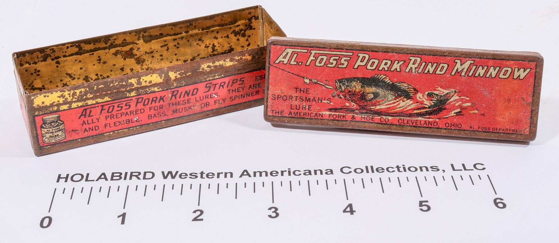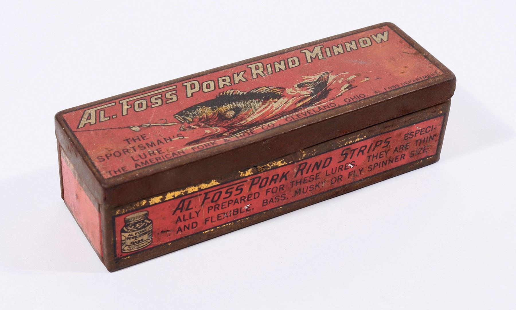 c. 1920's Al Foss Pork Rind Minnow red tin with largemouth bass ready to strike! 1x4x1.205". Some rust, no dents. Gary Bracken Collection