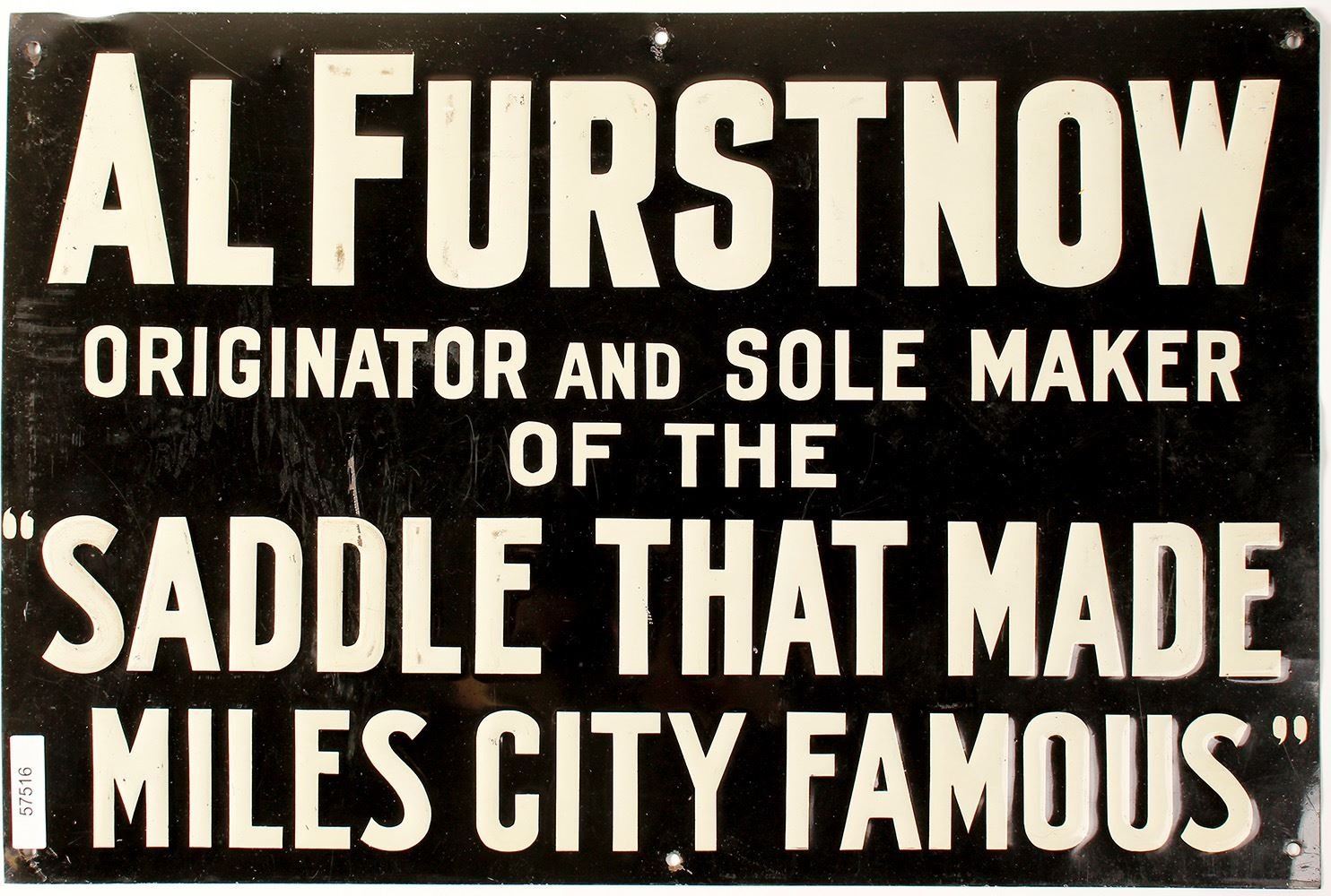 "Albert Frank Furstnow was born on February 22, 1862 in Fond Du Lac County, Wisconsin. After discontinuing his connection with the E. Goettlich Saddlery, Al Furstnow re-entered the service of G. H. and J. S. Collins, becoming foreman of their shops at Omaha, Nebraska, and while in their employ outfitted Buffalo Bill's Wild West Show for the Paris Exposition. After spending another year at Cheyenne, Al Furstnow went to San Francisco, but in 1892 returned to Miles City, and until 1894 was connected with the Robbins and Lenoir Saddle Company." from vintagegunleather.com. Embossed tin sign reading "Al Furstnow / The saddle that made Miles City Famous". There are copies out there, but this one is genuine. In very good condition. This sign comes with the original receipt dated 1992. 14" x 20". Date: 1992 Location: Cody, Wyoming HWAC# 57516