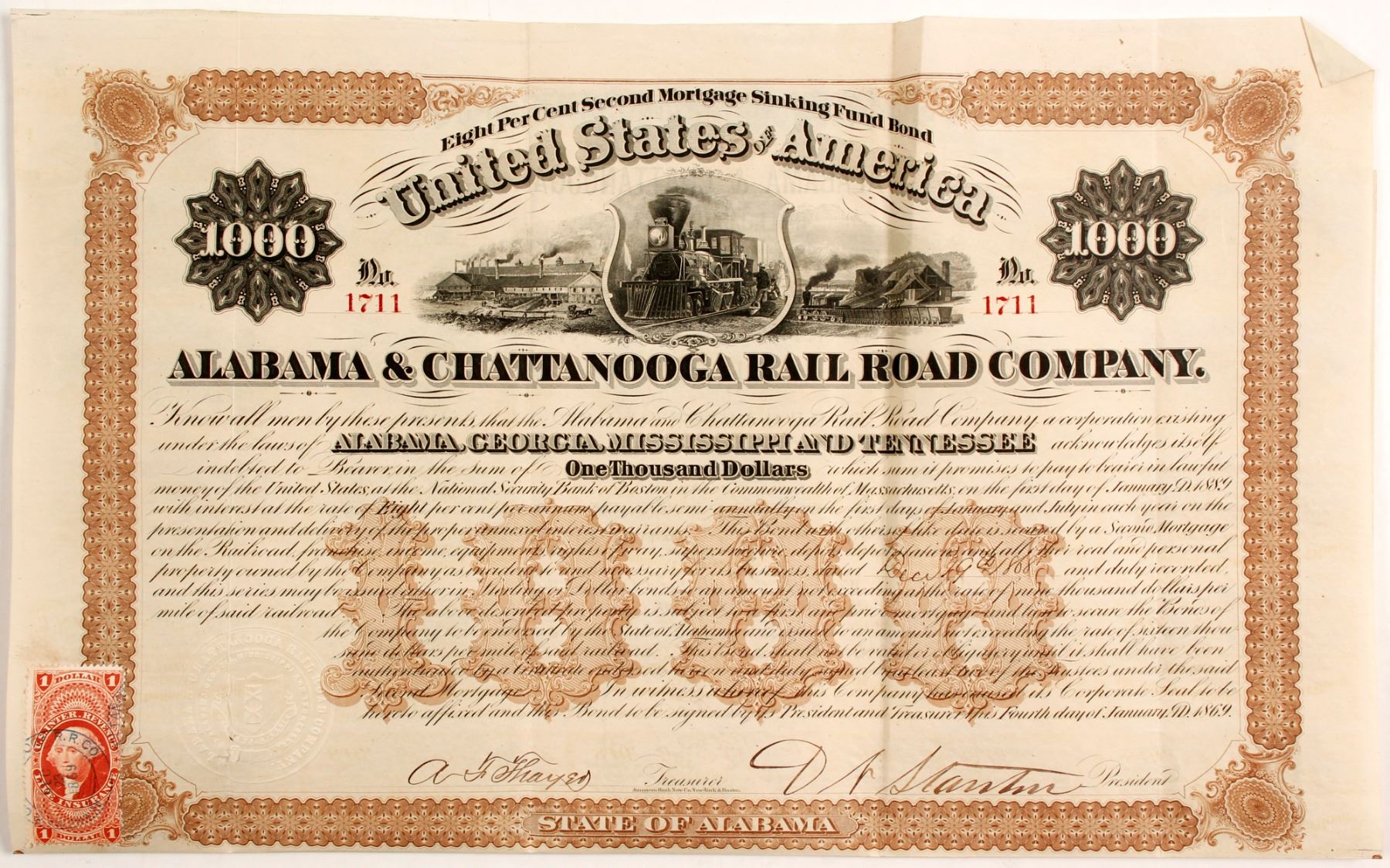 1,000 8% Second Mortgage Trustee's Certificate, Sinking Fund Bond Number 1711 with coupons, signed by D. A. Stanton, president. Principal payable January 1, 1889. Alabama & Chattanooga Railroad, was formerly known as the Wills Valley Railroad running through Jones Valley and chartered in 1852. Unlisted in Cox. Ken Prag Collection. State: City: Date: HWAC# 81536