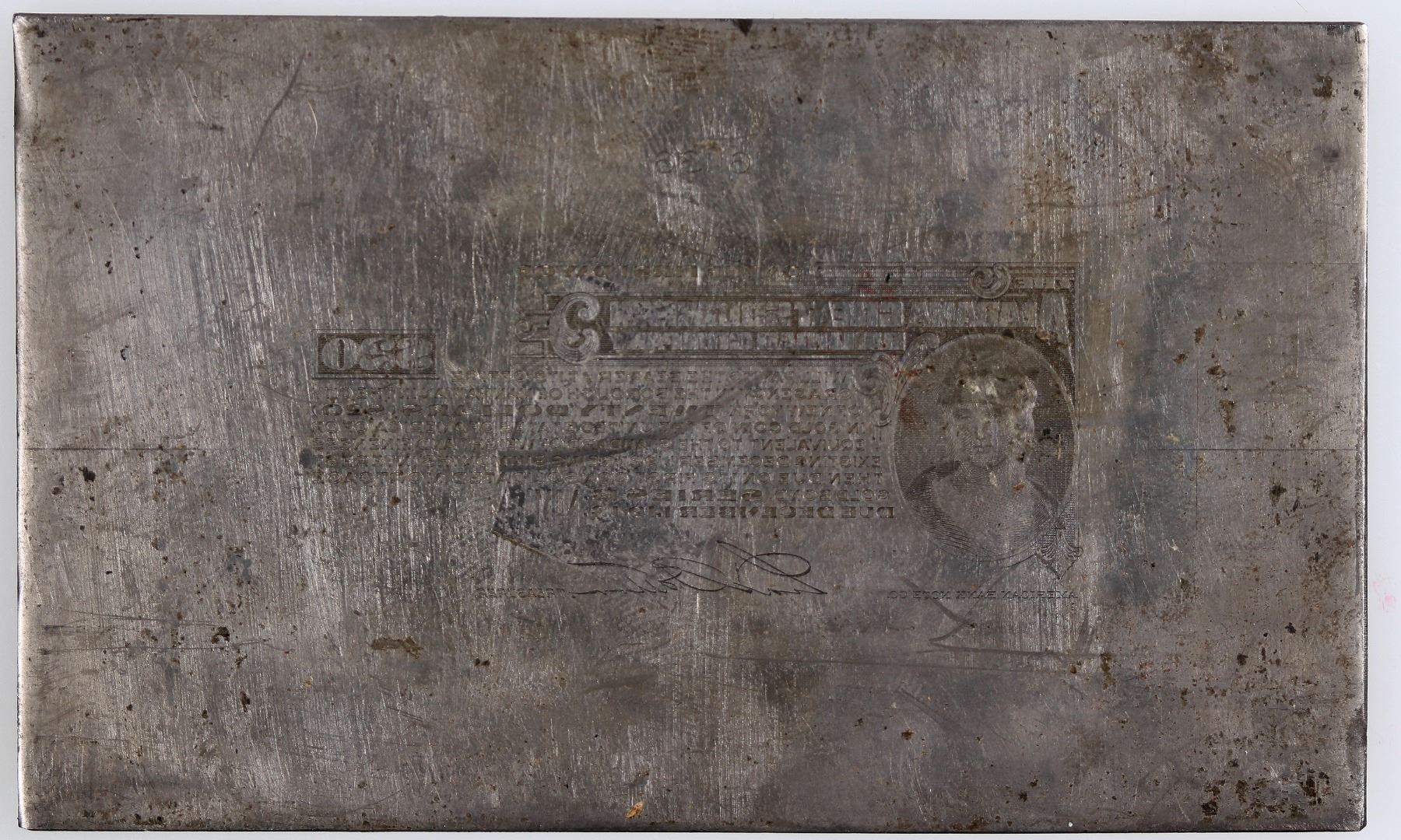 Steel printers plate for a bond coupon for The Alabama Great Southern Railroad Company. Redeemable for $20 in gold coin, 1927. Bond due in 1943. Vignette of a woman. Signed by the treasurer. American Bank Note Company. Identifying number "61136" at top. Reverse has S36619. Plate is 3 x 5" Founded in 1877. Operated in Alabama, Georgia, Louisiana, Mississippi, and Tennessee.