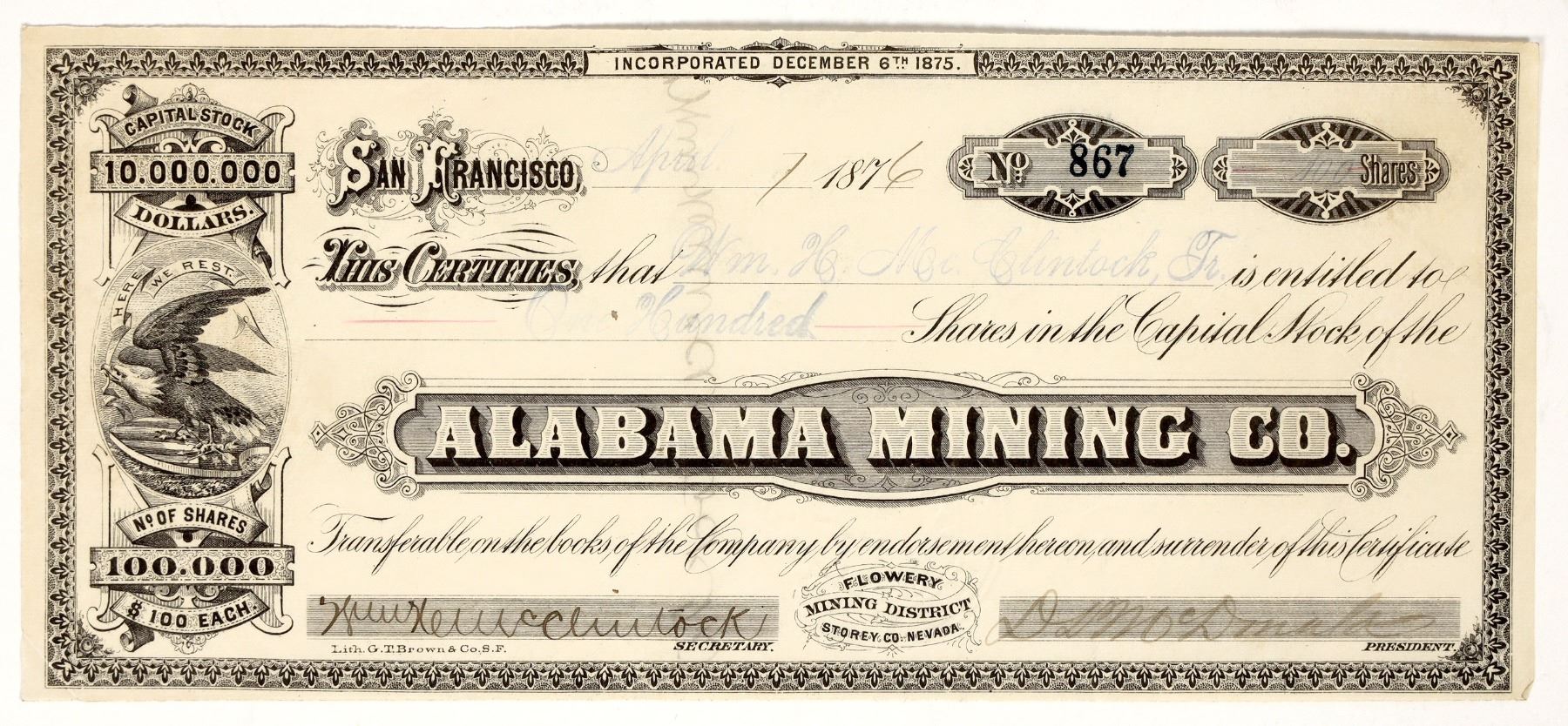 Flowery Mining District, Storey Co., Nevada (printed at bottom center). Inc. Dec. 6th, 1875. No. 867, issued for 100 shares to company secretary Wm. H. McClintock on April 7th, 1876 in San Francisco. Signed by McClintock and president D. McDonald. Not cancelled. Ornate border and black print, shaded logo, and vignette of bald eagle. Printed by noted African-American lithographer GT Brown, SF. Folds. 4 x 9" Segregated from the Lady Bryan and from the Queen. A shaft was located 1,300 feet from the works of the Lady Bryan. The vein is entirely unexplored. The nearest working is at the 380 ft. level of the Lady Bryan. Shaft will have two compartments. They will share the water pumping machinery of the Lady Bryan. [Annual Mining Review and Stock Ledger, 1876, pg. 35]
