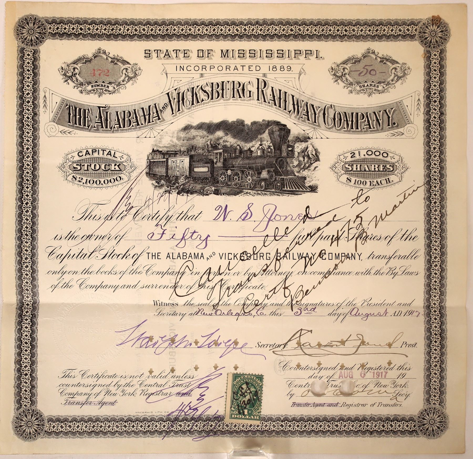The Alabama and Vicksburg Railway Company, incorporated in 1889 in Mississippi, issued to W.S. Jones for 50 share Aug. 6, 1917, signed by president illegible i/c