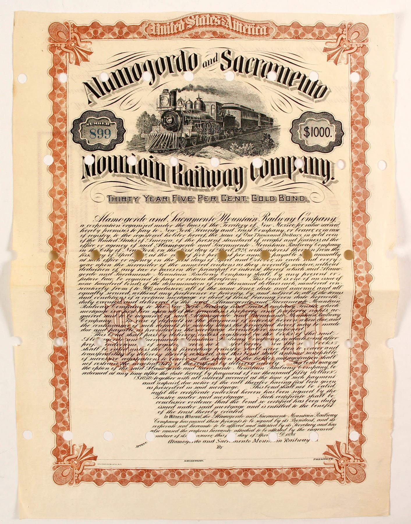 Bond #899 for $1000 to issued to New York Security and Trust company, Thirty year 5% gold coupon, April, 1898 due 1928 unsigned, vertical format, brown border, vignette top center train and cars r-l. Condition hole punched across bond. cox ref ic Ken Prag Collection