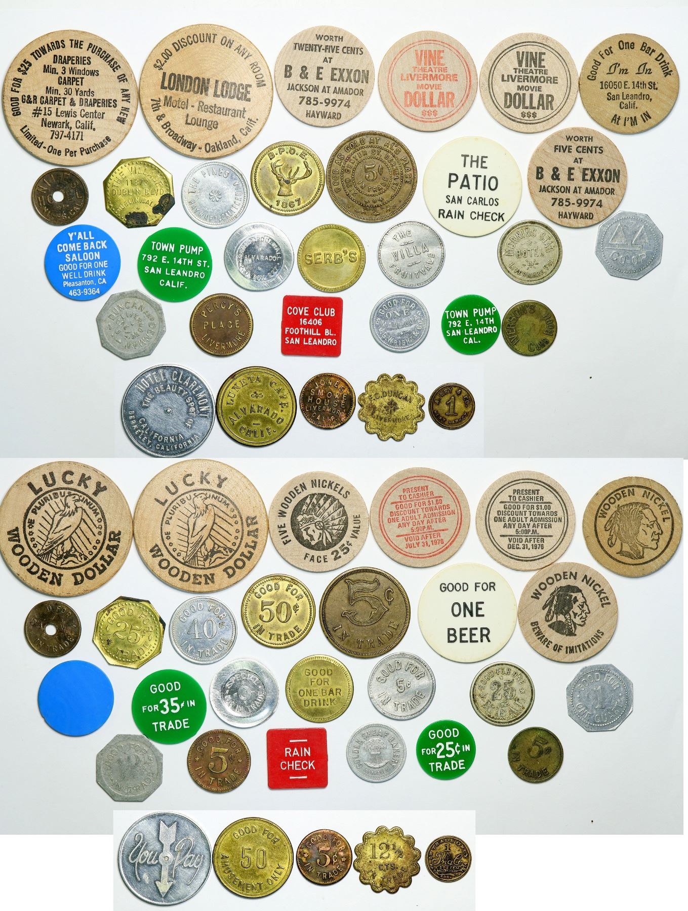 31 total. 18 metal:F.C. Duncan GF 12 1/2cents,Livermore, Manila Pool Hall Alvarado GF 10c (restrike), A. Ury & Co. Meat Market San Leandro GF IngCe System (1914), NIles Hotel Niles GF 5c, Luneta Cafe Alvarado GF 50 amusement, Serb's Albany GF one drink, The Village Dublin GF 25c, Al's Place Berkley GF 5c, Morning Star Hotel Livermore GF 25c meal, plus nine more.