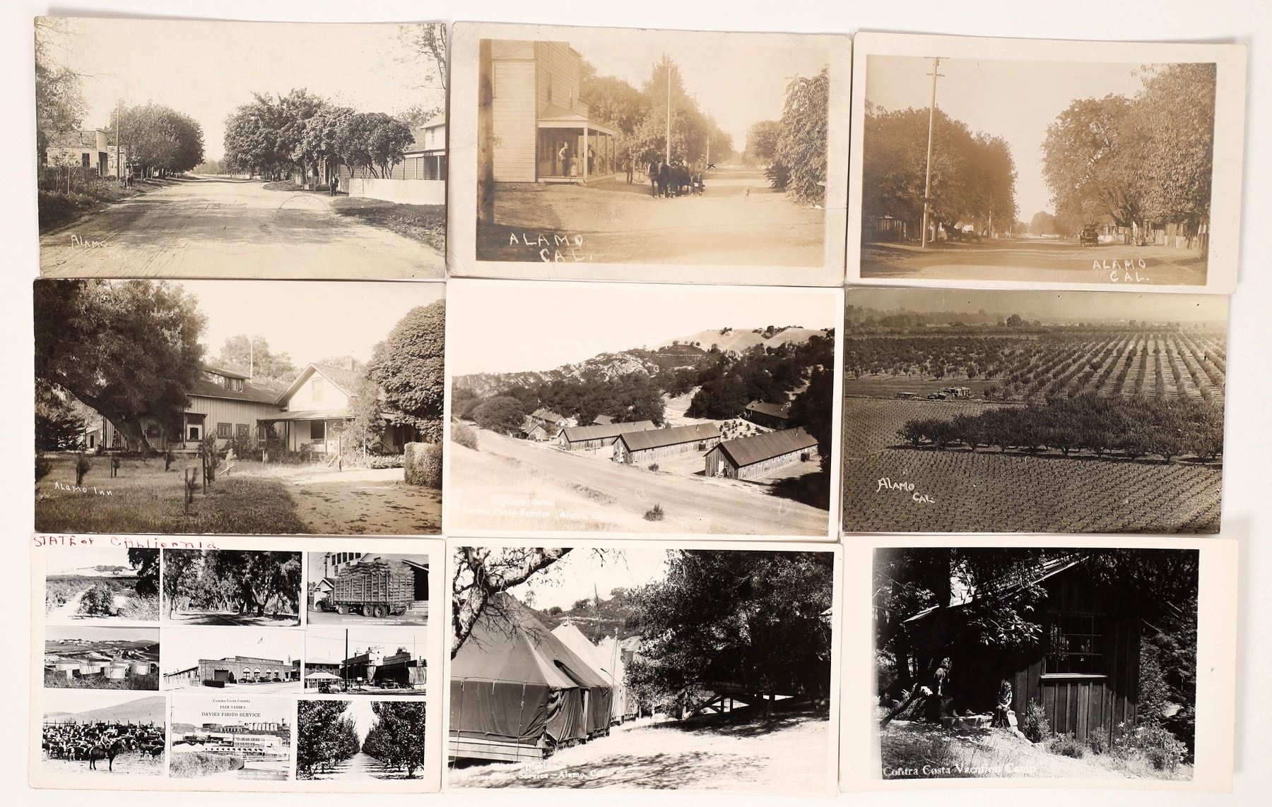 9 Alamo real photo postcards, 2x Camp Diablo, Industries with red pen writing, farm, vacation camp, 3x street scenes, Alamo Inn. c. 1909-13. British Columbia Alamo