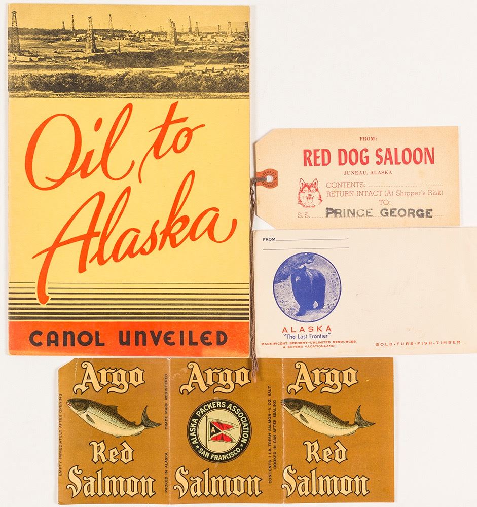 Envelope with bear cachet, Alaska "The Last Frontier" 3.5" x 6.5". Tag from Red Dog Saloon to return contents to S.S. Prince George with Husky cachet 2.5" x 5.75". Argo Red Salmon fold out with 2 salmon images. Stated benefits include palatable, nutritious, wholesome, economical. 4" x 9.5". Booklet Oil to Alaska by Myers. 40 pages with history of Alaskan oil pipeline and many B/W photos.10" x 6.75". Date: Location: Alaska HWAC # 53278