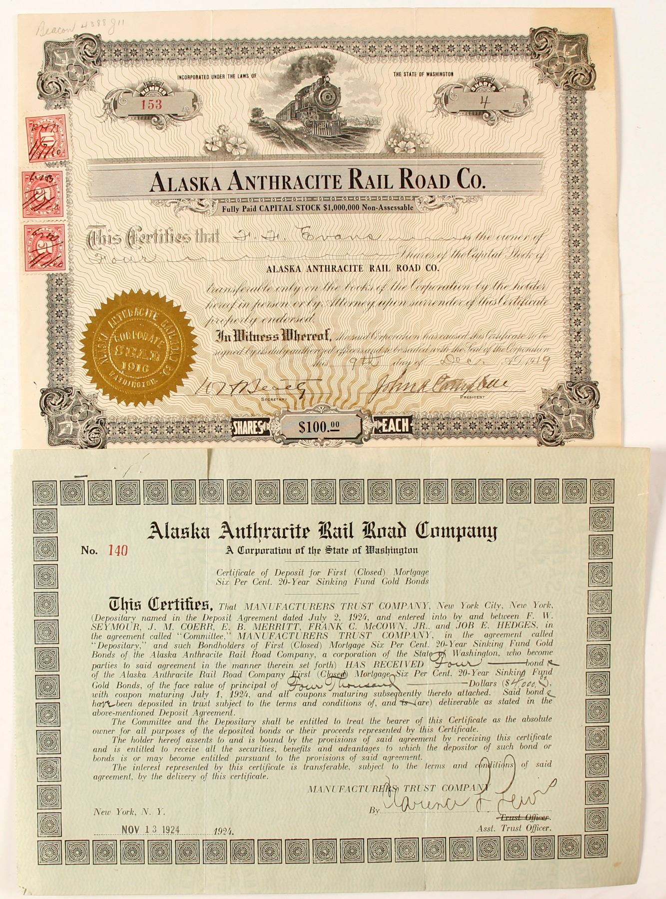 Bond and Stock for Alaska Anthracite Rail Road Company. 1) Four shares of capital stock for F. F. Evans, number 153, dated December 9, 1919 with revenue stamps, signed by John Campbell, president. 2) Certificate of Deposit for 1st Mortgage 6%, 20-year Sinking Fund Gold Bonds, number 140, signed November 13, 1924 by Clarence L. Lewis, Asst. Trust Officer. Alaska Anthracite Railroad Company was formed around 1907 to attempt to take advantage of the Bering River coal fields. A big winter storm destroyed the Copper River and Northwestern Railway in Katalla area curtailing their access to the Palm Point area and the Bering River coal fields, which had to be replaced. Ken Prag Collection. State: City: Date: HWAC# 83643