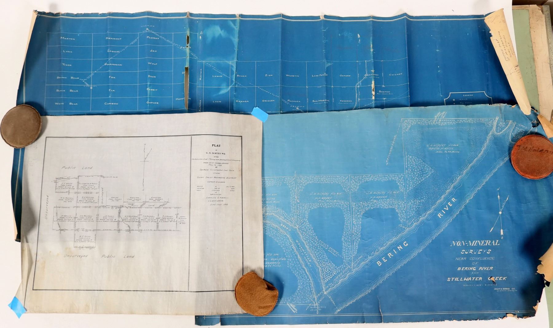 Five maps. Original pen and ink Mantanuska Coal Mining & Dev. Co. map, 1908, Chas S. Hubbell, about 20 x 30"; Sketch Map of Mantanuska Coal Fields by Hubbell, 1906, about 20 x 40" blueling with folds and tears; Coal claim og Grant Calhoun by McPherson, about 12 x 18"; Preliminary survey of the Herendeen Portage Railroad for the Pacific Alaska Transportation and Coal Co., 2 maps 1903, about 20 x 40; map of "non mineral" lands along the Bearing River. by Dwight Skinner, undated, about 1902, blueline. same size. All from the J.L. McPherson engineer files. No info could be found on the Herendeen railroad, and it may never have been built.