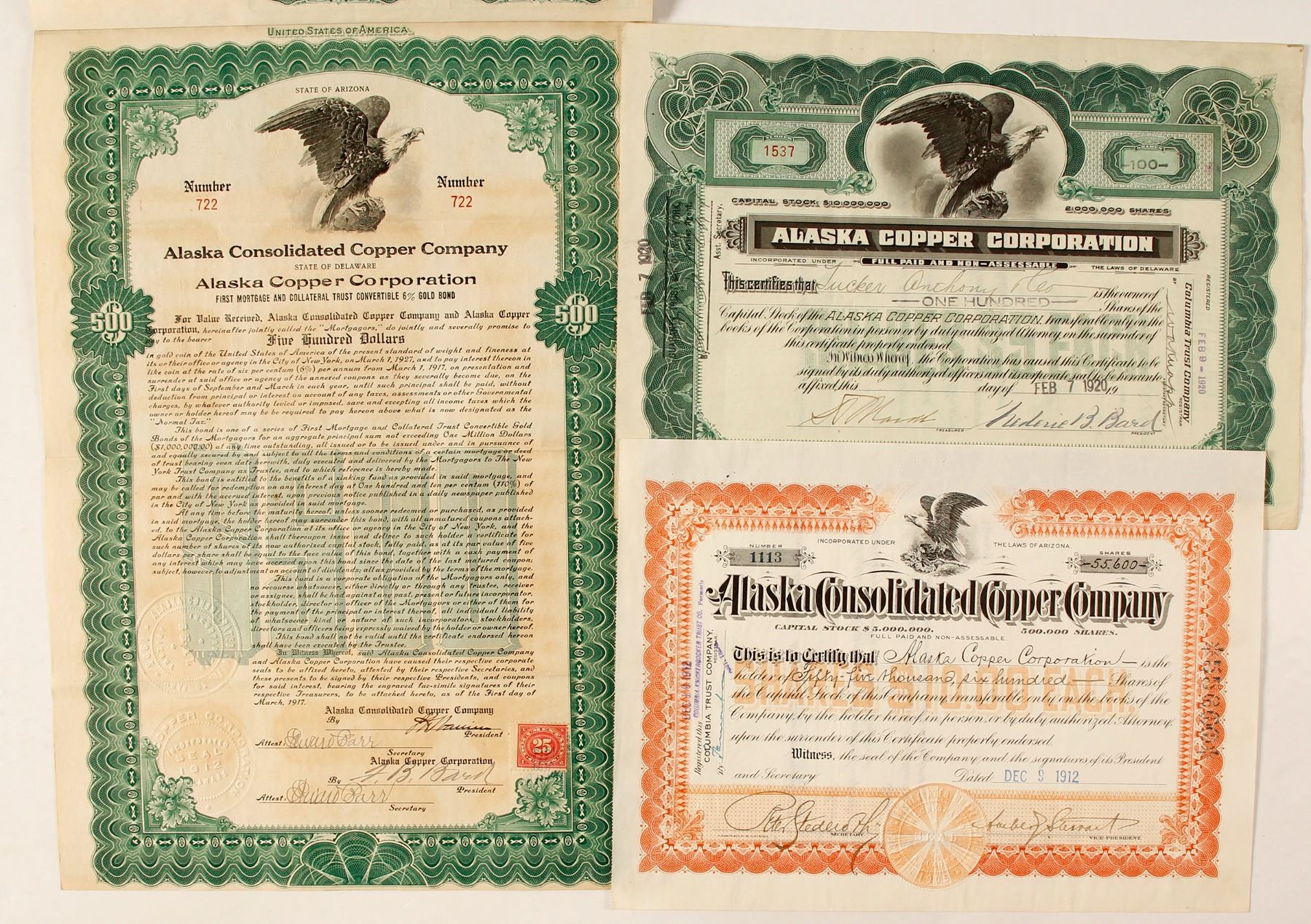 Two different capital stock certificates and one First Mortgage and Collateral Trust Convertible Gold Bond. 1) One hundred shares of Alaska Copper Corporation number 1537 issued to Tucker Anthony Leo dated and counter signed February 7, 1920. Green border. Large eagle vignette.Printed: Security Bank Note Company, Phila. 2) Fifty-five thousand, six hundred shares of Alaska Copper Corporation number 1113 issued to Alaska Copper Corporation dated December 9, 1912. Countersigned December 10, 1912. Small eagle vignette. Orange border. Printed: H. C. Smith & Co. 3) First Mortgage and Collateral Trust Convertible 6% Gold Bond, Payable March 1, 1927, signed James Dodd, Vice-president. Revenue stamp coupons. Ken Prag collection. Alaska