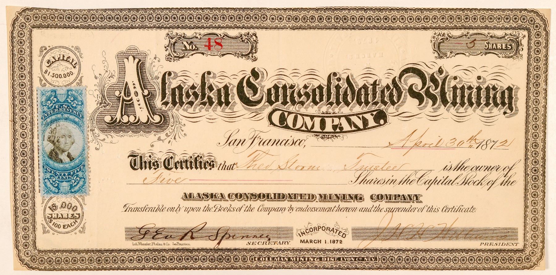 Coleman Mining District, Lyon County, Nev. (printed at bottom center). Inc. March 1872. No. 48, issued for 5 shares to Theo. Stone on April 30th, 1872. Signed by president JHH Williams and secretary Geo. R. Spinney. Not cancelled. Ornate black border and company logo, no vignette. Printed by Wheeler, Phelan & Co., SF. One 25 cent US IR stamp attached on the left. Pinholes, folds, border trimmed tight all the way around. 4.5 x 9.5" This district is not listed by Tingley. Not a district listed for Lyon County on mindat.org. Not in Filer or other Holabird indexes. Not in Carlson. Besides mentions of the incorporation and assessments, we can find no other specific information about this company. Rare district! Ken Prag Collection