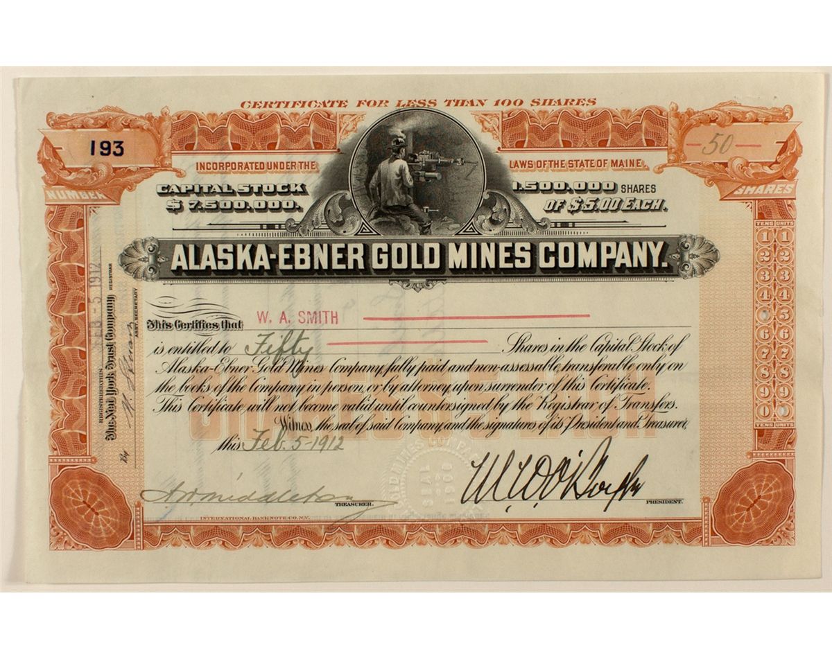 Inc. in Maine. No. 193, not cancelled. Issued to W.A. Smith on Feb 5, 1912.Signed by the president and the treasurer. Nice vignette of miner with drill. Orange border. International Bank Note Co. 6" x 9.5" Folds and pinholes. Prag Collection
