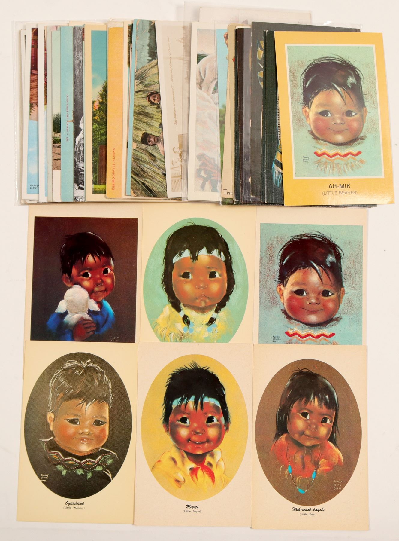 55 original color postcards from Alaska including Eskimos. 8 "Children of the North" postcards from Audrey Young Oppel's original pastel, many totem poles, Pacific Northwest Indians, Native attire with bead work and fur, arctic animals, Eskimo families by igloo, Eskimo graves and Harman postcards of Alaskan Indians and Pacific Northwest people in colorful dress and artifacts. Brian Thaler Collection