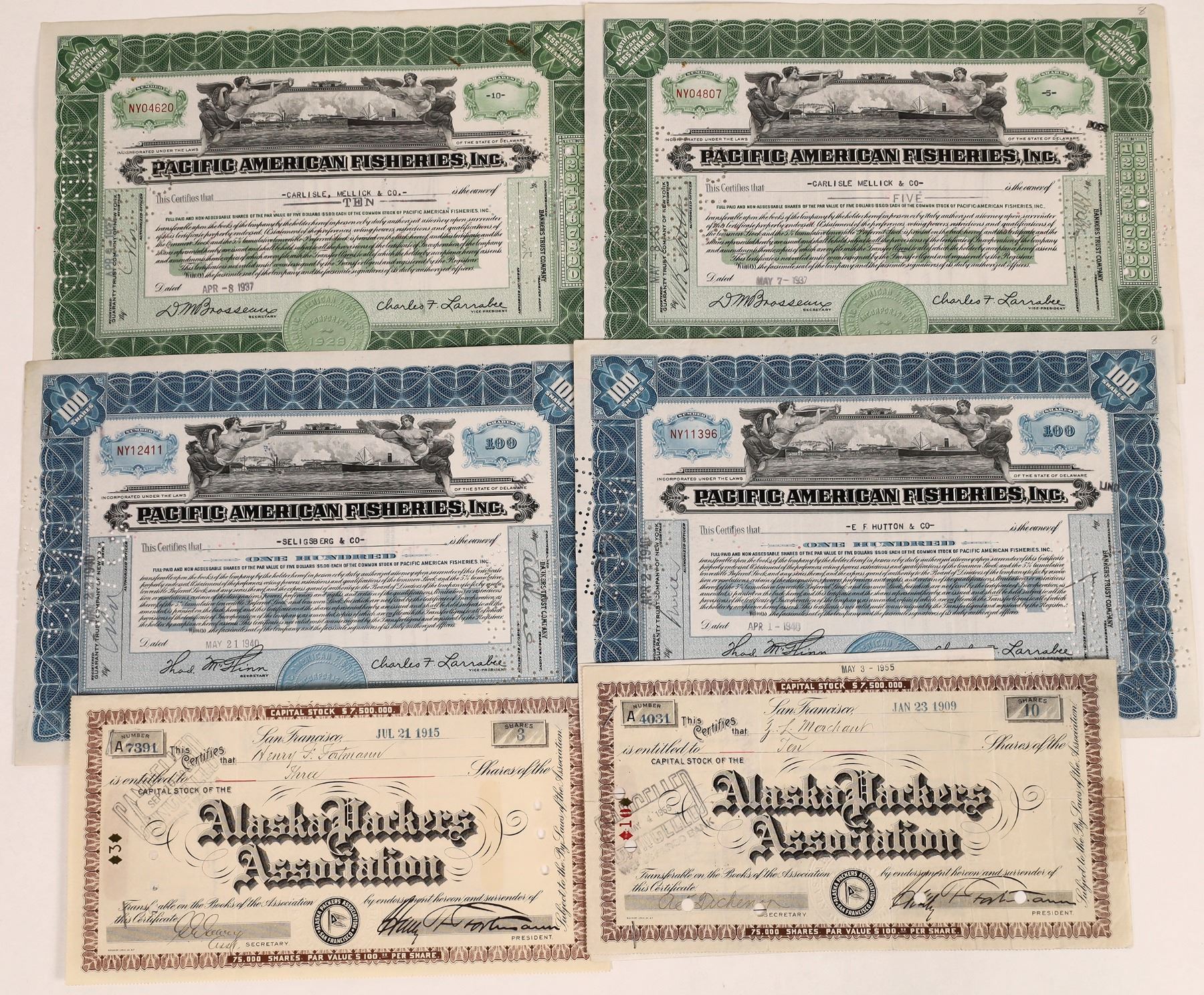 Lot of 6, two different companies. 1) Alaska Packers Association. Two stocks, issued in 1909 and 1915. Both punch cancelled. 2) Pacific American Fisheries, Inc. Four stocks, two varieties. Issued 1937-1940, punch cancelled. Blue or green borders, vignette of ships and factory on waterfront.