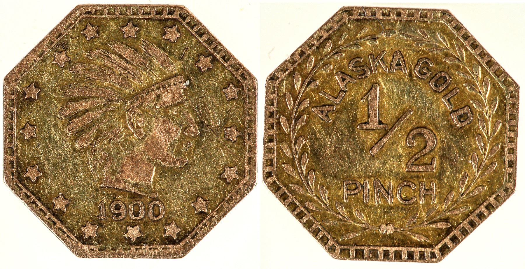 Hart's Coins of the West 1900 octagonal Indian head obverse; Alaska Gold / 1/2 Pinch. 10 mm; 0.7 grams. F-EF condition.