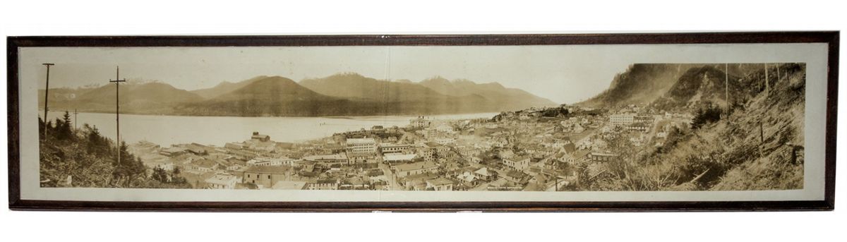 Fabulous framed panorama of Juneau, Alaska. View shows the town site on the water. Lots of great detail. Sheelor Photo. In wooden frame. No matting. Total framed dimensions: 61.5" x 13." F.W. Sheelor was known for his California scenic photography before he travelled to Alaska and photographed the Alaska Gold Rush. An issue of The Salt Lake Mining Review from April 15, 1915 describes Sheelor in Haines, noting "Mr. Sheelor and his estimable wife have taken in the camp and different points of interest in Alaska," and that he "has the largest circle camera in the world, and is doing great work with it." Burger CollectionCity: JuneauCounty: State: AKDate: