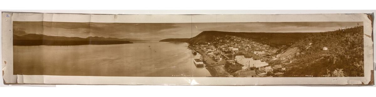 Unframed panorama of Ruby, Alaska shot by F.W. Sheelor. Half of view is dominated by the Ruby River. Paddleboat docked at town site. Buildings being constructed on hillside to the right. Wheeler Photo. Several tears on both right and left side, with pieces missing. Portion of image that is of the town is in the best shape. Great historical Alaska item. Measures approx. 60" x 12." Burger CollectionCity: RubyCounty: State: AKDate: