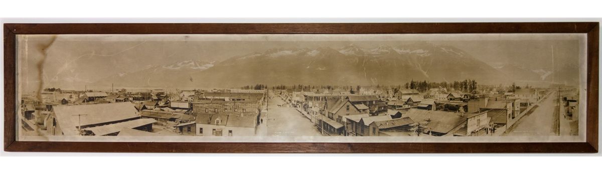Another wonderful panorama of Valdez, Alaska in 1916. View shows town with majestic mountains in the distance. Horse and buggy on street. Sheelor Photo. In wooden frame with no glass. Soiling and damage on left side. Smudges and dirt across most of the photo. A small "X" has been drawn on one of the streets (someone pointing themselves out?). Scratch marks on right side. Even in condition, still a great piece of Alaska Gold Rush history. Framed measures 55" x 12.5." Burger CollectionCity: ValdezCounty: State: AKDate: