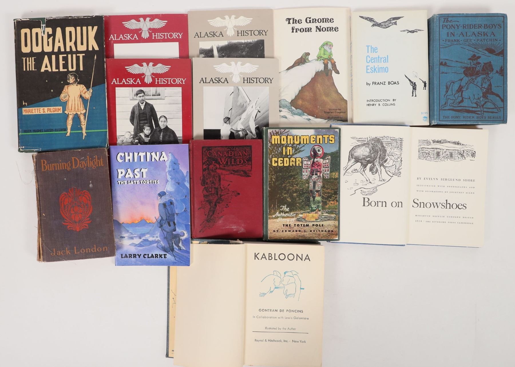 A group of 13 books on general Alaska topics, published 1888-2002, with most books written in the mid-1900s. The lot includes books on the history of Alaskan frontiersmen and settlers; the history and culture of the Inuit people; biographical and autobiographical accounts of Alaskans; fictional narratives set in Alaska; and the practices of hunting, trapping, and subsistence in Alaska. A few of the older books have extensive damage to their spines ; while all are intact, they are fragile. See photos for the titles of the books.