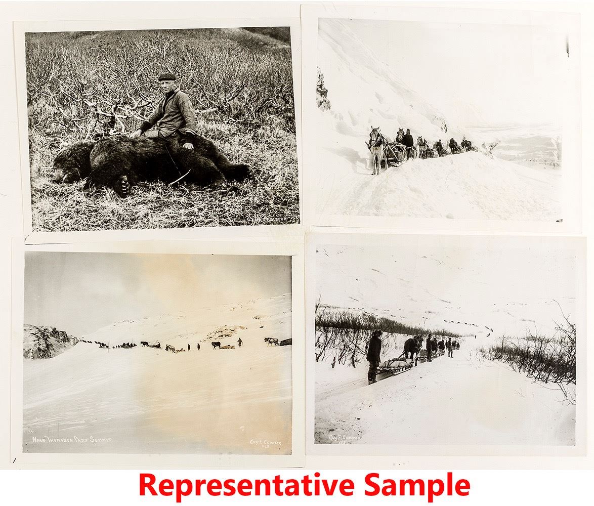 Lot of 9 photographs, mostly 6 x 8. Some Guy F. Cameron attributed. All but one of these photos shows one horse per sled hauling a load in the snow. One shows twelve horses pulling an elongated building (train car) advertising going out of business sale. Two are overviews of fifteen such teams. Two photos of bear trophies - one a Cameron photo shot in Unga, Alaska Date: Location: Alaska HWAC # 44231
