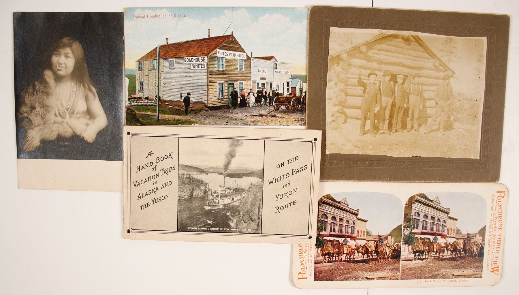 Lot of 5. 1) "A Hand Book of Vacation Trips in Alaska and the Yukon on the White Pass and Yukon Route." 55 pp. booklet with many photos, c.1920s. 2) Color tinted stereoview, Pack Train for Mines, Alaska. Barnes-Crosby Co., Chicago.Copyright 1905 by HC White. 3) Printed color postcard, Typical Roadhouse of Alaska. Shows White's Road House, Post Office, and Kougarock Saloon. Not mailed. AYPE souvenir (1909). 4) RPPC of bare breasted Native woman, Kla-Claa, copyright 1906 by Casey Draper. Not mailed. 5) Mounted photograph of 5 men in front of rustic log cabin. One is holding up a revolver. 3.75 x 5" on 5.25 x 6.25" mount. Weak contrast. Not identified. Date: City: State: Alaska HWAC# 77571