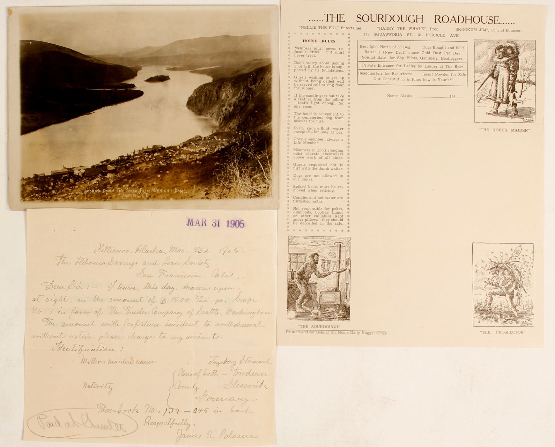 Lot of 3. 1) Best is unmounted bird's-eye view photograph of Dawson, Yukon Territory. "Looking Down from Midnight Dome." By Larrs & Ducloy (?). 6.25 x 8.5" Large creases. Nice contrast. c.1898. 2) Unused humorous illustrated lettersheet, "The Sourdough Roadhouse," Nome, 1930s. Printed by the Nome Daily Nugget Office. Vignettes of prospectors and Eskimos. House rules printed on the left and not to be overlooked. Folds. 3) Manuscript document from Killisnoo, Alaska, 1905 to a savings bank in San Francisco. Signed by James G. Blaine. 7.25 x 7.75" Folds, some separation.