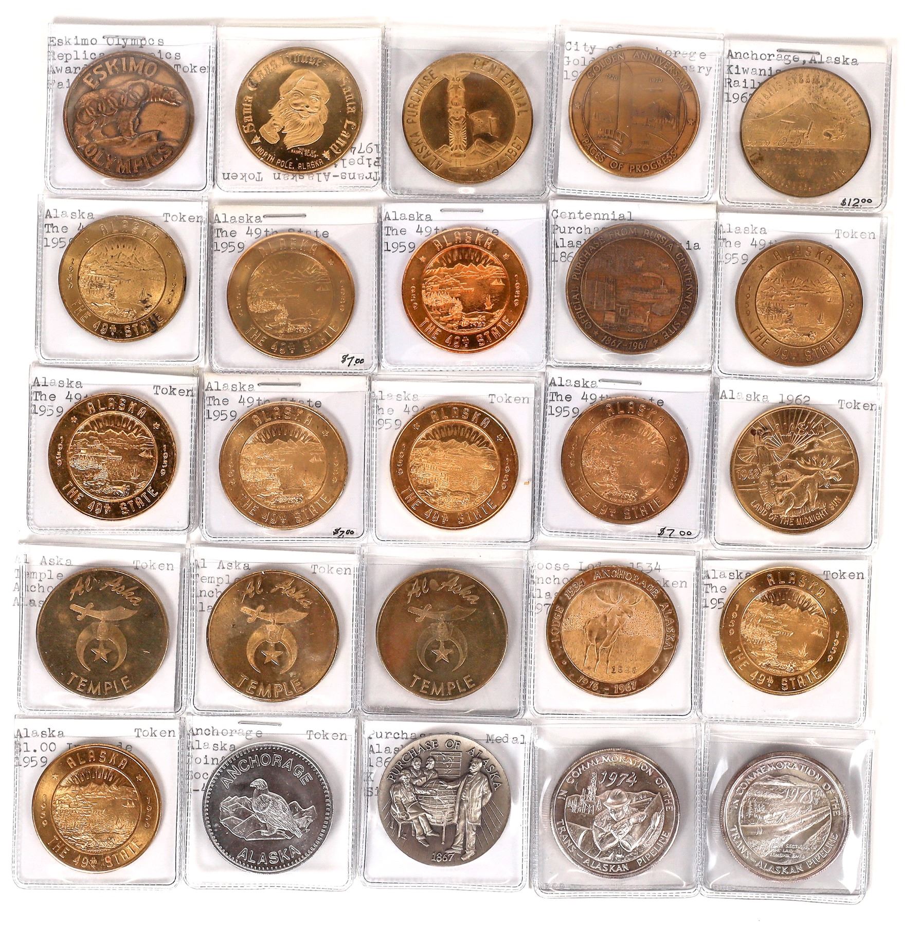 Lot of 25 medals from the 49th state. Three are silver: 1) Purchase of Alaska 1867 (Longines symphonette high relief); 2) 1975 Trans-Alaska Pipeline; 3) 1974 Trans-Alaska Pipeline. Among the 22 bronze: 1959 49th State; Al Aska Temple Anchorage; Eskimo Olympics 1965; Kiwanis Steam Railroad; 1967 Centennial Purchase; Anchorage Coin & Stamp Society. Alaska